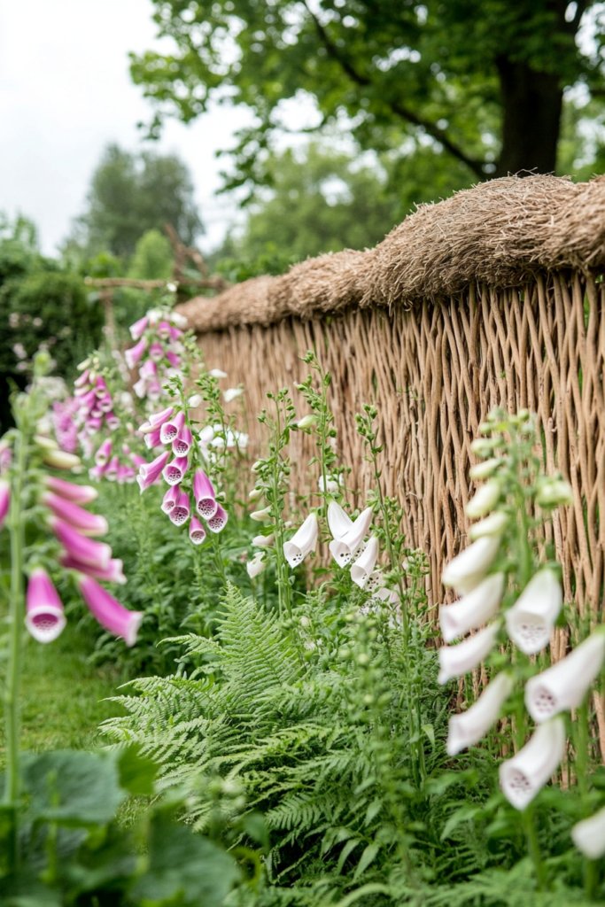 A handwoven wattle fence with a charming thatched top, surrounded by soft ferns and delicate pink and white foxgloves. The organic, woodland-inspired setting is ideal with moss-covered stepping stones, wooden barrels, and cozy garden nooks.