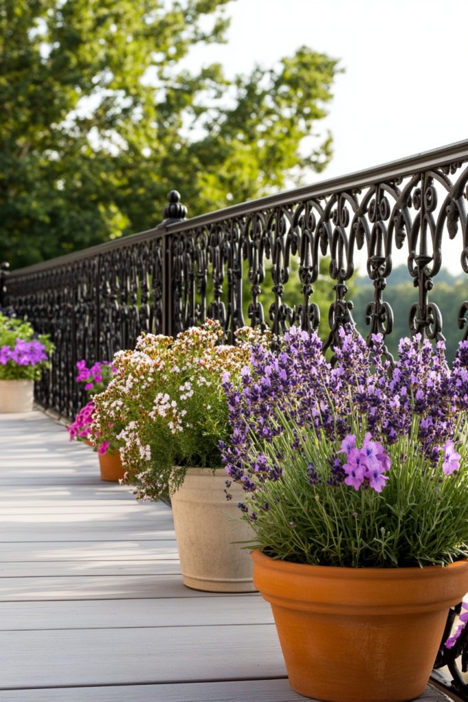 Ornate black wrought iron with intricate details provides an elegant frame for fragrant lavender and vibrant potted geraniums. The rich contrast between metal and blooms makes this an ideal cottage garden entrance. Complete the scene with stone pathways and vintage urn planters.