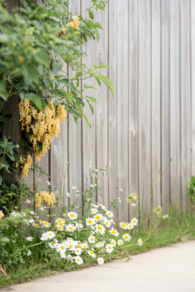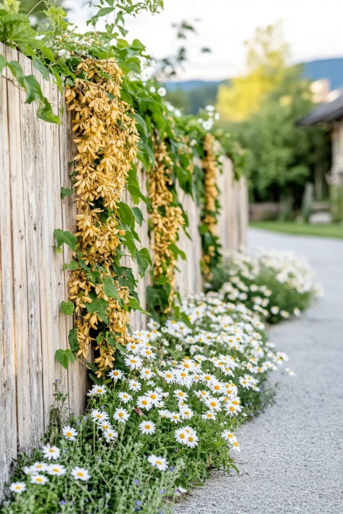 A beautifully weathered wooden fence wrapped in golden honeysuckle vines, surrounded by a lush border of white daisies and creeping thyme. Enhance this timeless garden look with cast-iron planters, vintage benches, and a wooden trellis archway.