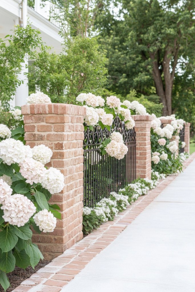 This timeless fence combines aged red brick with decorative wrought iron, creating a stately yet romantic border. Pale pink and white hydrangeas spill over the edges, softening the structure. Enhance the look with trailing ivy and vintage lanterns for a storybook feel.