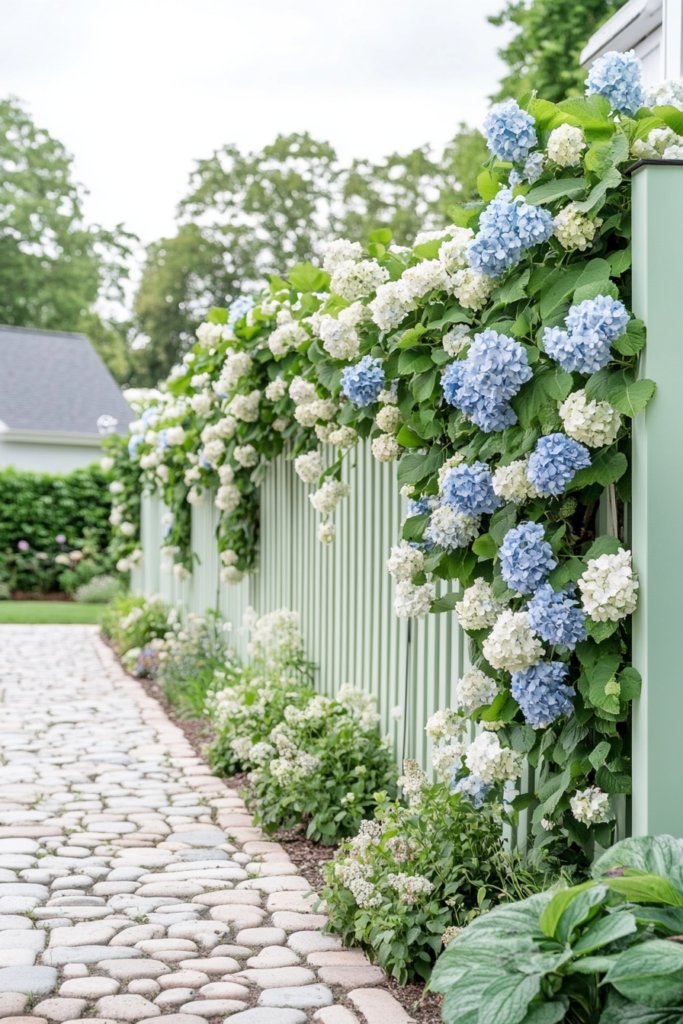A pale mint green wooden fence wrapped in climbing hydrangeas, their delicate blue and white blossoms spilling over the top. A charming cobblestone pathway leads the way, enhancing the soft, romantic aesthetic. Add a vintage birdhouse or floral wreath for extra charm.
