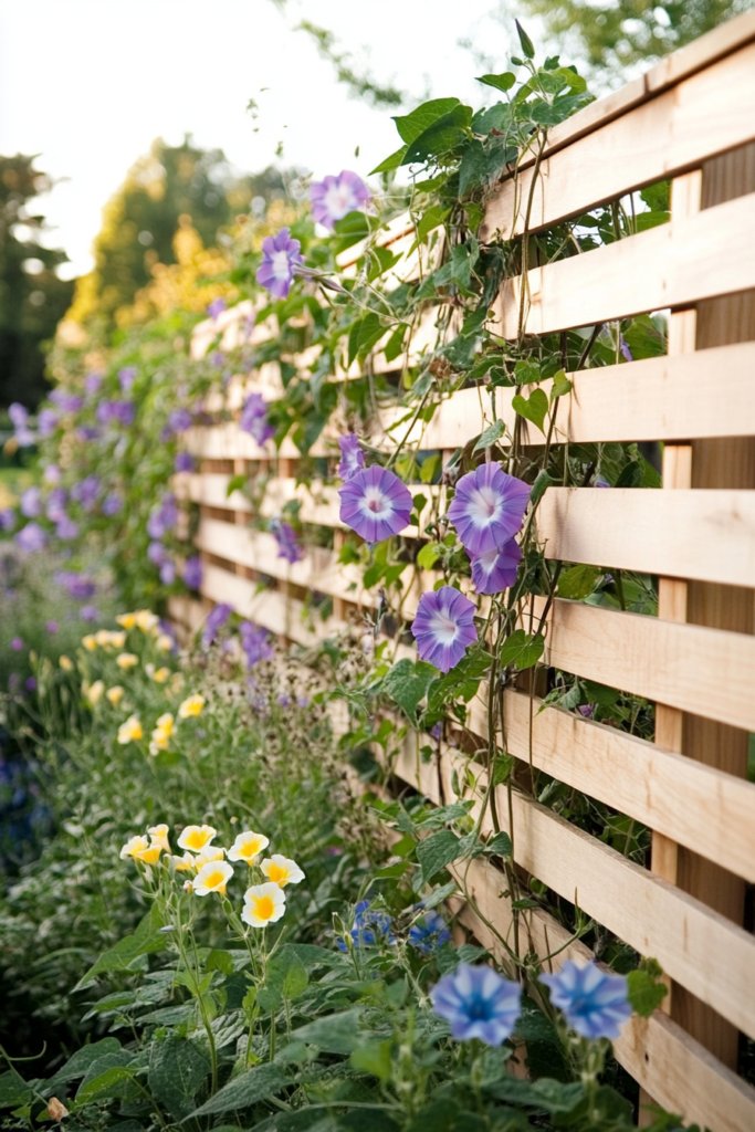 A rustic wooden slat fence entwined with climbing vines, featuring clusters of purple morning glories and soft yellow buttercups. This naturally wild look is complemented by vintage iron trellises, weathered stepping stones, and wooden garden markers.