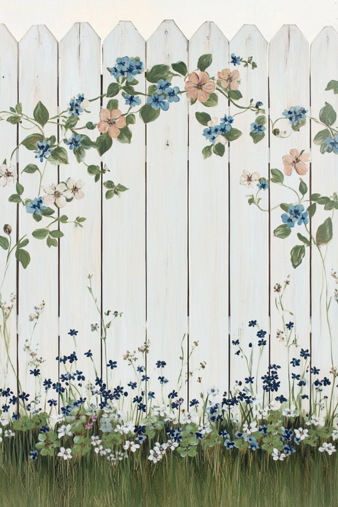 A delicate white wooden fence, hand-painted with whimsical floral motifs, provides a picturesque border for a garden of forget-me-nots and wild violets. Soft and artistic, this design pairs perfectly with lace-edged curtains in a nearby cottage window.