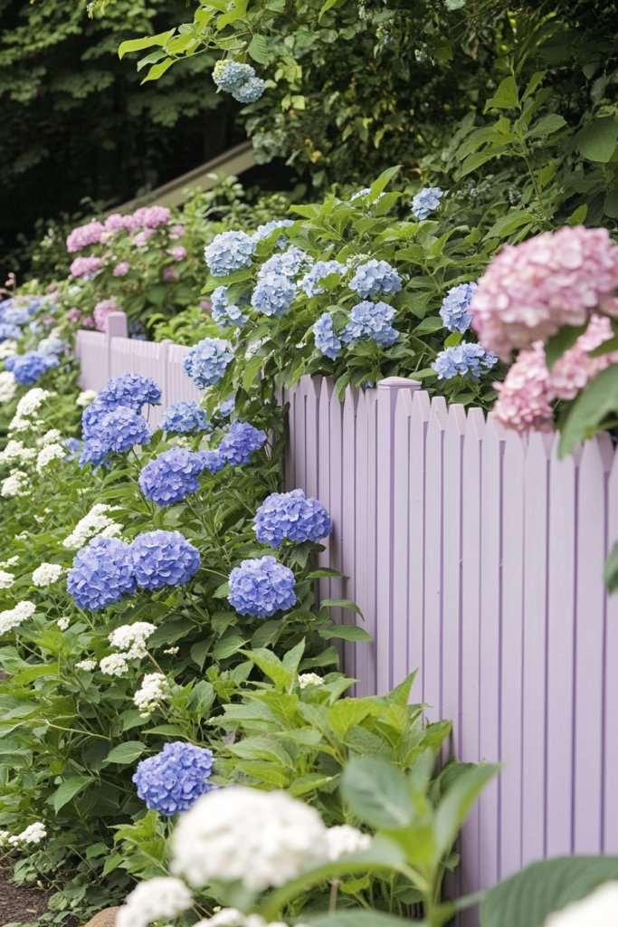 A pastel lavender wooden fence enveloped by lush blue and pink hydrangeas, with white alyssum spilling over the edges. This charming scene pairs beautifully with a white wooden garden swing, soft floral cushions, and delicate lace curtains in nearby windows.