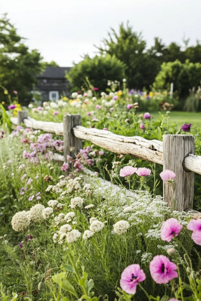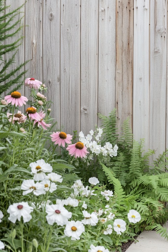 A weathered wood fence framed by vibrant pink echinacea, soft white poppies, and delicate fern-filled borders. The rustic appeal is perfect for a country garden, especially when paired with vintage metal watering cans, woven baskets, and aged terra cotta pots.