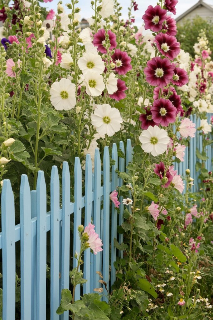 A pastel blue wooden picket fence surrounded by towering hollyhocks in shades of pink, white, and deep red. This romantic cottage garden setting is perfect with a weathered wooden gate, vintage floral fabrics, and wrought iron seating.