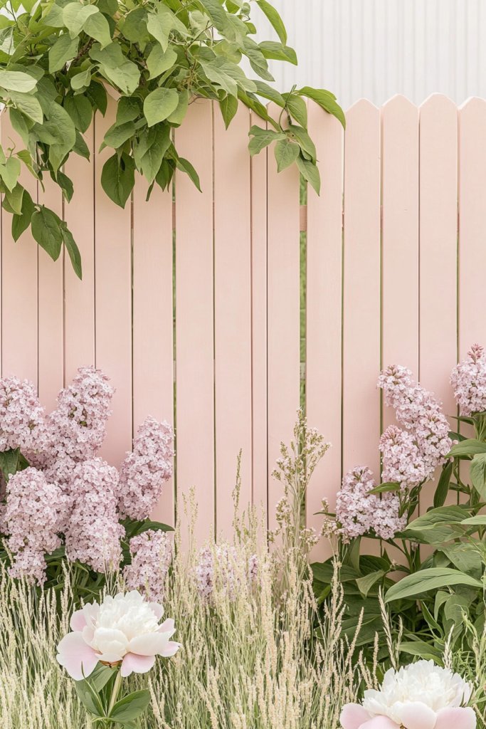 A romantic pale pink wooden fence nestled among lush lilac bushes, filling the air with their sweet scent. Soft wild grasses and delicate peonies add to the dreamy atmosphere. Accentuate with vintage garden tools, ceramic birdbaths, and a lace-trimmed bench cushion.