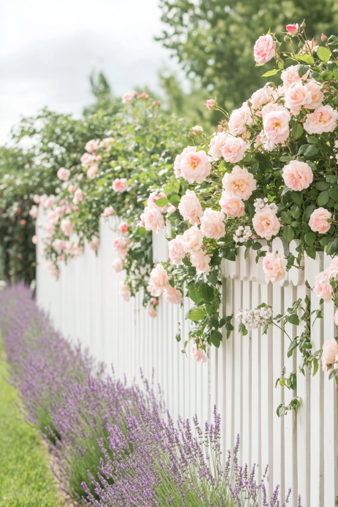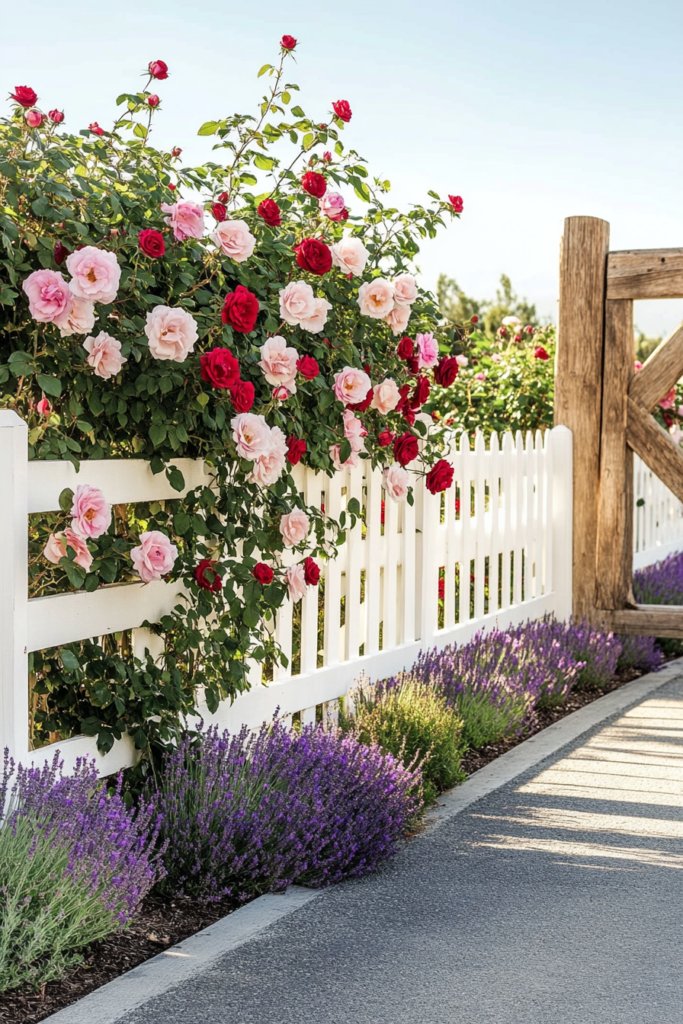 A timeless white picket fence adorned with cascading pink and red roses, with lavender-lined borders and a rustic wooden gate. Enhance this classic English garden look with wicker baskets, floral-print cushions, and a winding stone pathway.