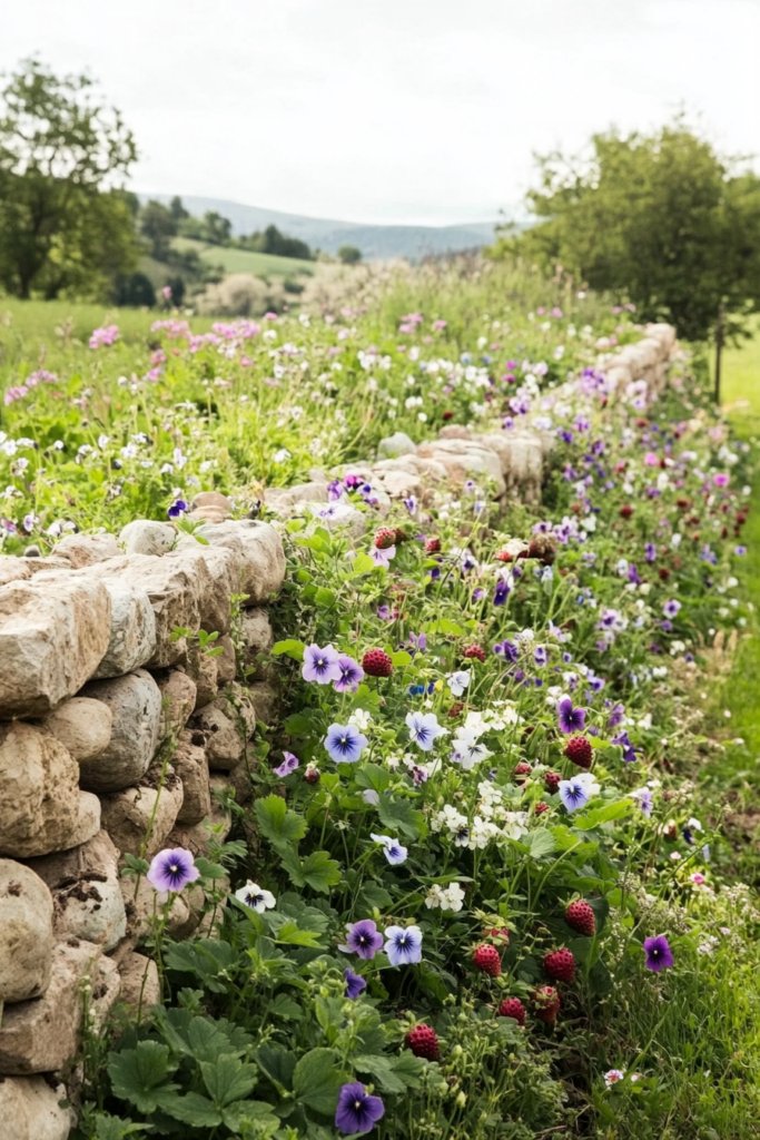 A timeless dry-stone wall, its gaps filled with trailing violets and wild strawberries, blending seamlessly into a flower-filled meadow. The organic, natural charm makes it a perfect companion to winding garden paths and wooden trellises covered in climbing roses.