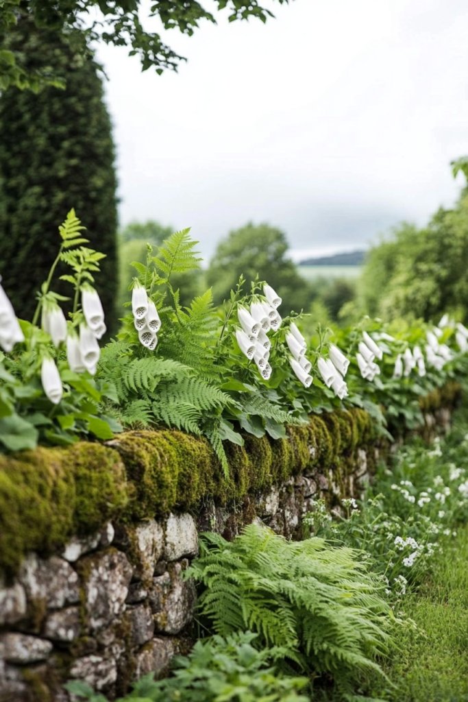 Aged stone, rich with character, is softened by creeping ivy, delicate ferns, and white foxgloves. This fence evokes the timeless feel of an old-world English garden. Pair with a weathered wooden gate and a shaded bench for a peaceful retreat.