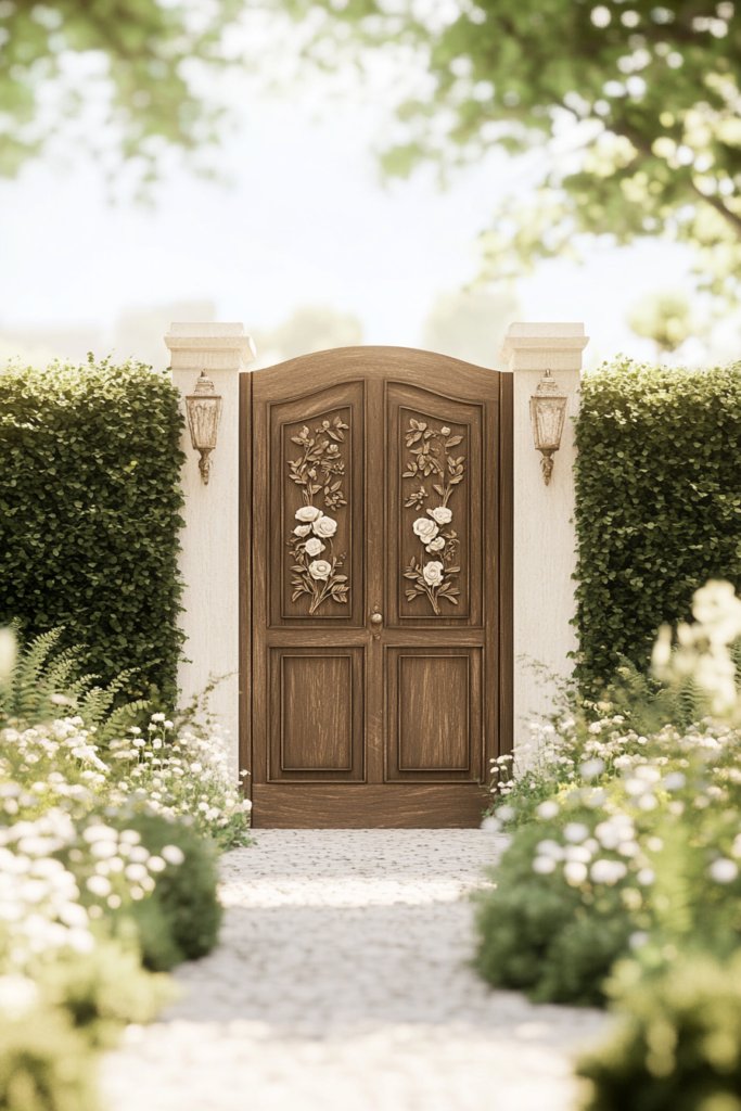 A beautifully detailed wooden gate, intricately carved with floral motifs, nestled among hedges of wild roses, soft ferns, and daisy-filled . Add an old-fashioned iron latch and a climbing honeysuckle vine to complete the romantic, fairytale-like setting.