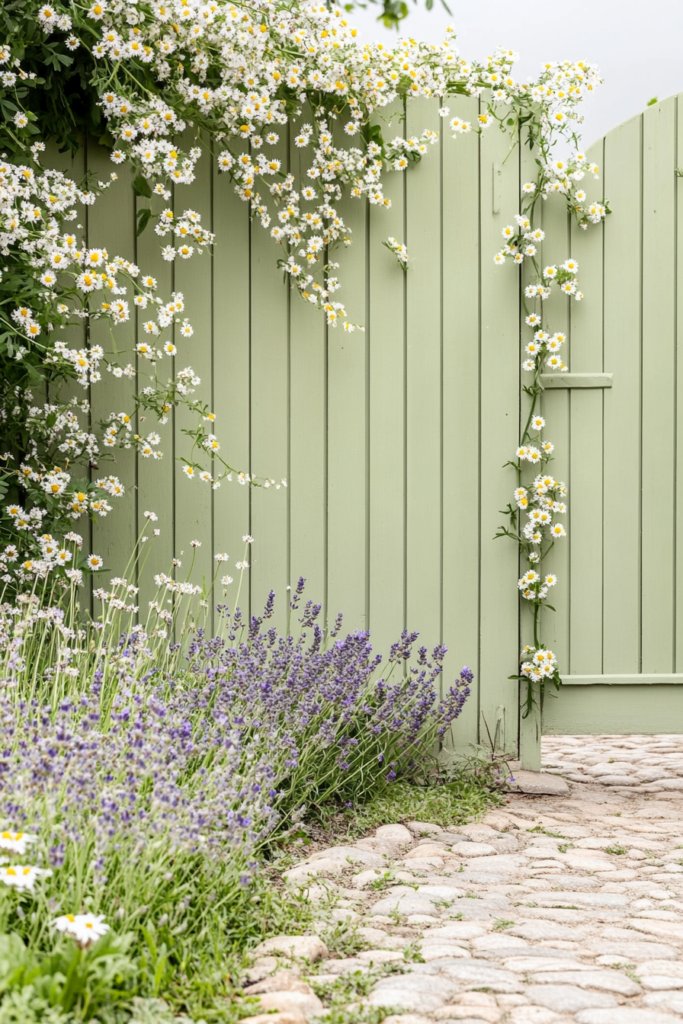 16. Pale Green Wooden Fence with Chamomile and Lavender
