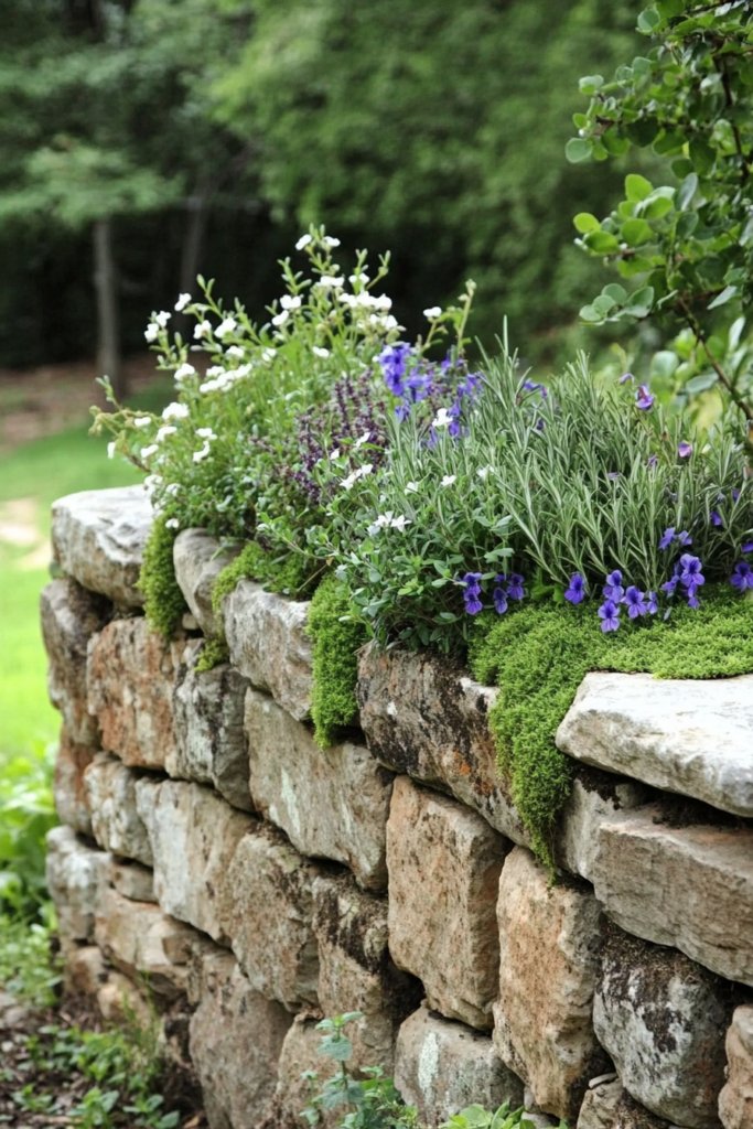 A rustic stone wall adorned with aromatic rosemary, thyme, and marjoram, with soft moss and delicate violets peeking through the crevices. This cozy, fragrant feature is ideal for a cottage garden’s kitchen corner, especially when paired with terracotta planters and a well-worn wooden bench.
