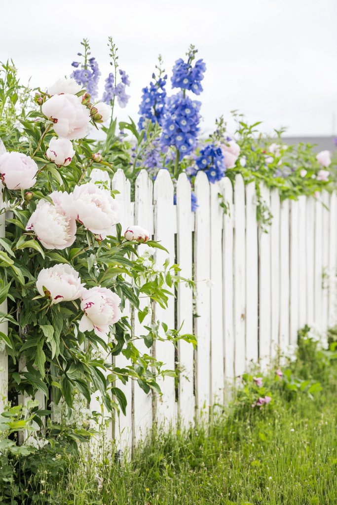 A distressed white wooden fence brimming with cottage charm, adorned with soft pink and towering blue delphiniums. Creeping jasmine weaves through the slats, adding delicate fragrance. Pair with a weathered garden bench and vintage-style planters for a dreamy floral retreat.