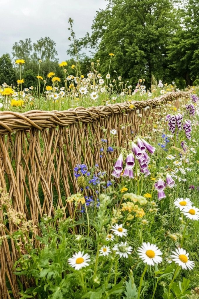 A beautifully handwoven willow fence surrounded by a meadow of wildflowers, featuring daisies, foxgloves, and swaying tall grasses. The organic, nature-inspired setting is best paired with rustic wooden benches, birdhouses, and stone footpaths winding through the garden.