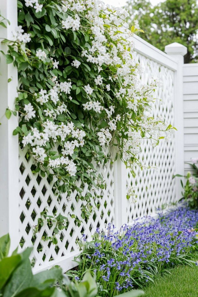 A delicate white lattice fence covered in climbing jasmine, its fragrant blossoms filling the air. Beneath it, a soft carpet of bluebells and violets adds an ethereal charm. Complete the look with a vintage watering can, dainty iron chairs, and soft candlelit lanterns.