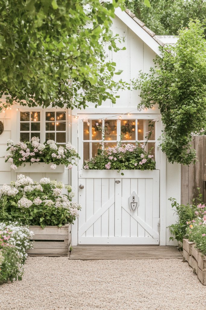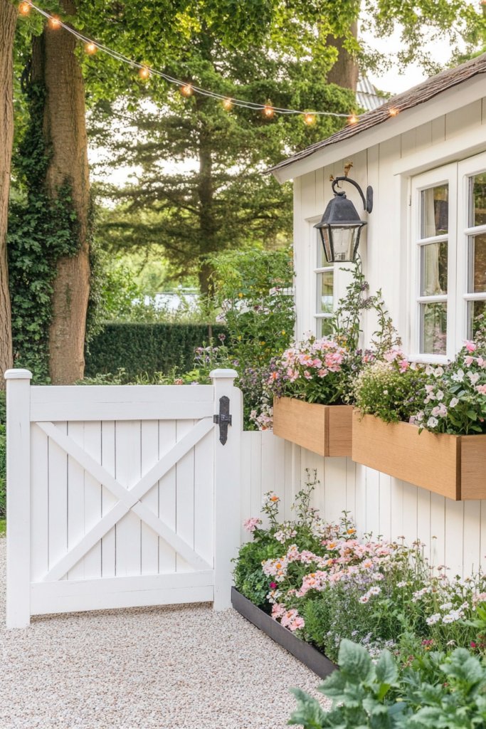 Overflowing window boxes, a whitewashed wooden gate, and soft pastel flower borders create a storybook scene. Delicate fairy lights strung between trees complete the enchanting atmosphere. Use trailing blooms, rustic gates, and soft illumination to capture this classic English cottage feel.