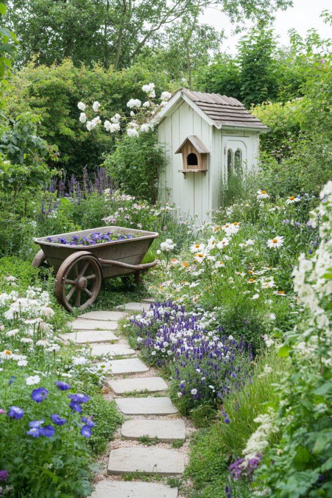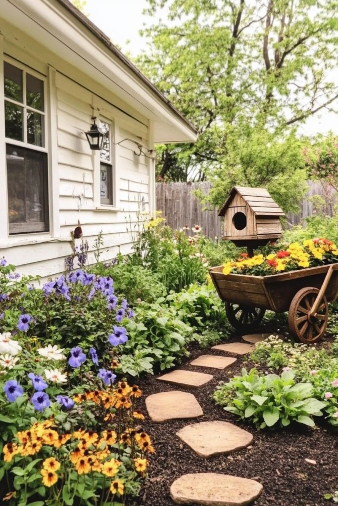 A whimsical stepping stone path winds past an old wooden wheelbarrow repurposed as a flower bed, with a rustic birdhouse nestled among lush blooms. Recreate this magical space with reclaimed garden decor and a mix of vibrant florals.