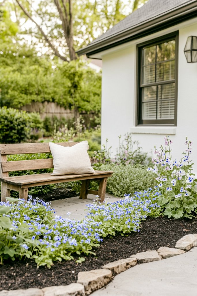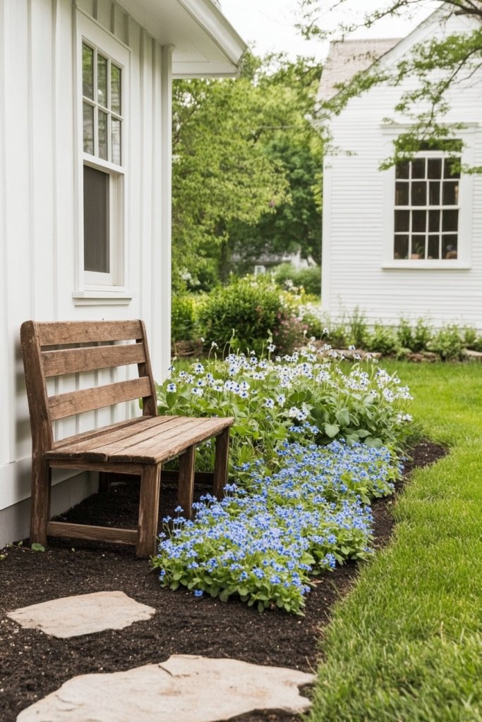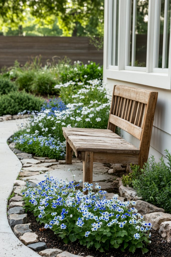 A reclaimed wood bench sits among clusters of forget-me-nots and hollyhocks, bordered by rustic stone edging. This small yet lush space captures the essence of cottage charm. Incorporate antique-style seating and colorful perennials to replicate its whimsical beauty.