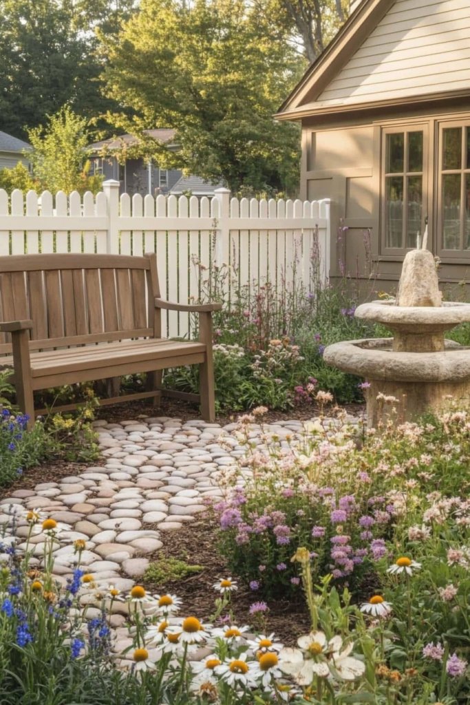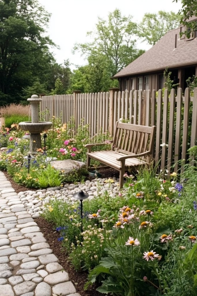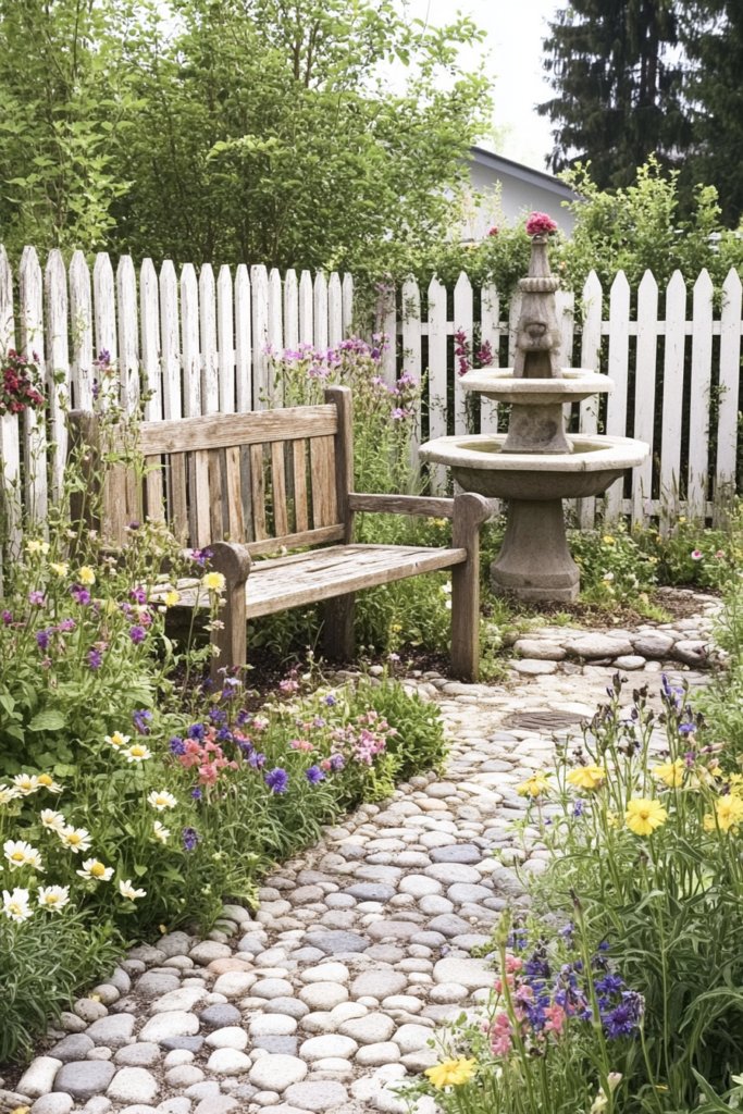 A weathered picket fence embraces wildflowers and a cobbled path leading to a rustic wooden bench. An old stone fountain adds a tranquil touch, making this compact space feel like a countryside escape. Recreate this look with native blooms, vintage accents, and natural stone elements.