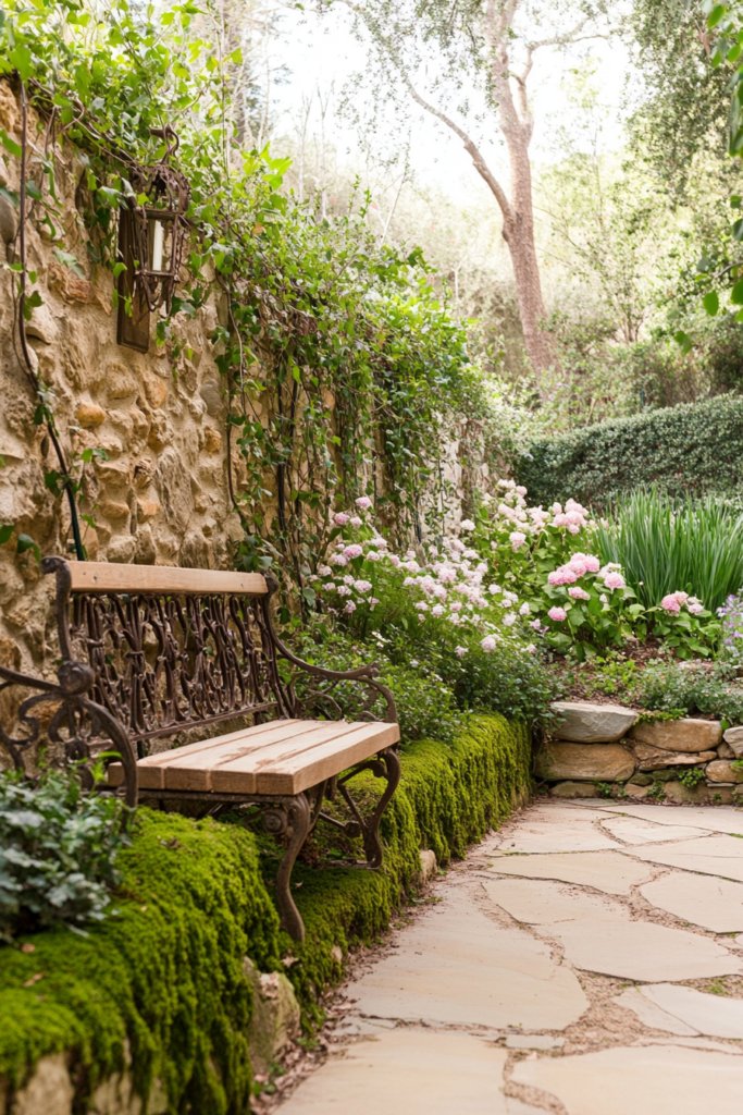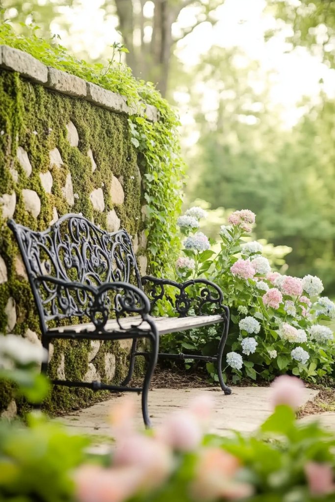An ornate iron bench rests against a moss-covered stone wall, framed by delicate climbing vines and pastel blooms swaying in the breeze. To achieve this dreamy look, incorporate weathered stone, romantic florals, and antique-style seating.