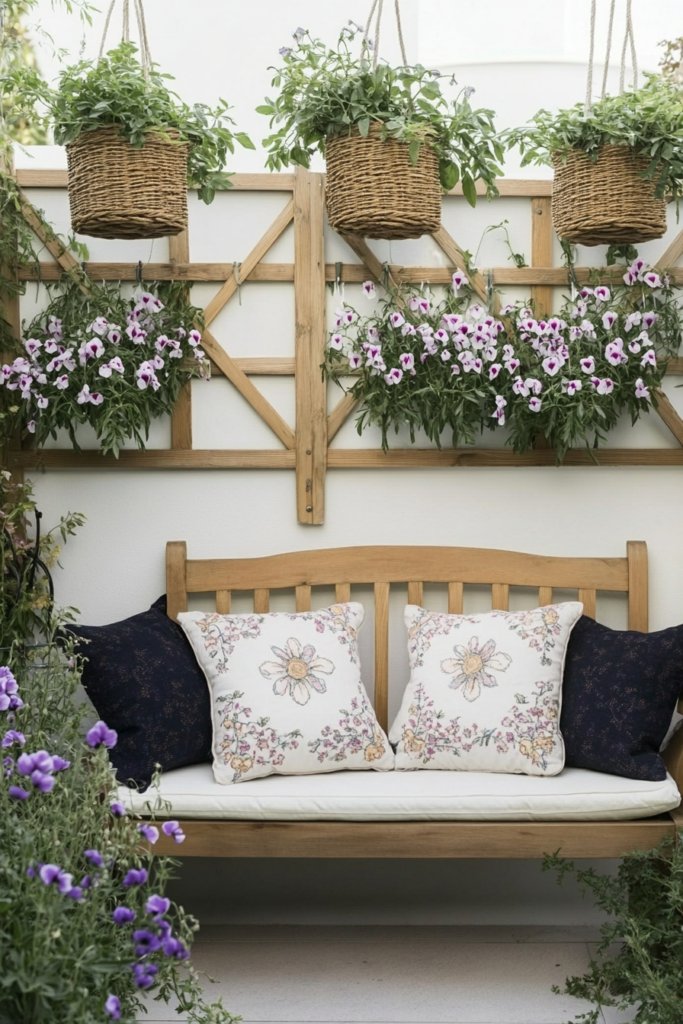 A cozy cottage-style balcony filled with hanging flower baskets, wooden trellises draped in sweet peas, and a rustic bench adorned with embroidered cushions. Recreate this charming escape with compact vertical gardening, trailing blooms, and cozy seating.