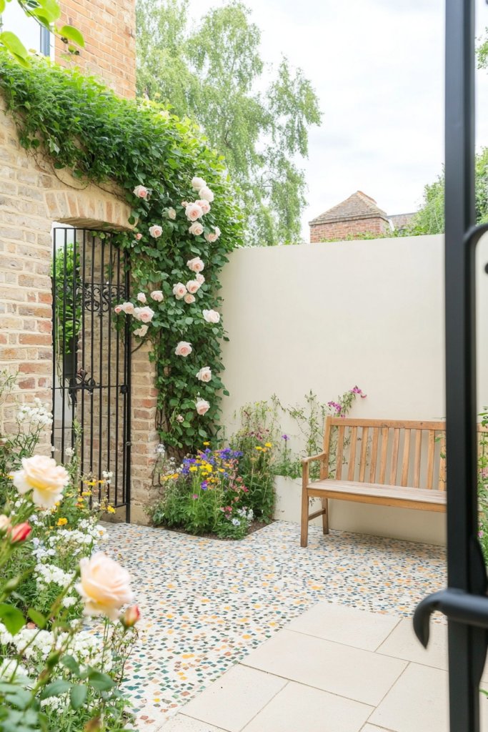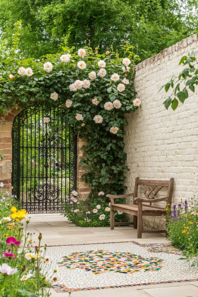 Climbing roses cascade over a rustic brick wall, complementing a vintage iron gate and a mosaic-tiled courtyard filled with colorful wildflowers and a wooden bench. Capture this timeless charm with heritage roses, aged brick, and antique-inspired garden pieces.