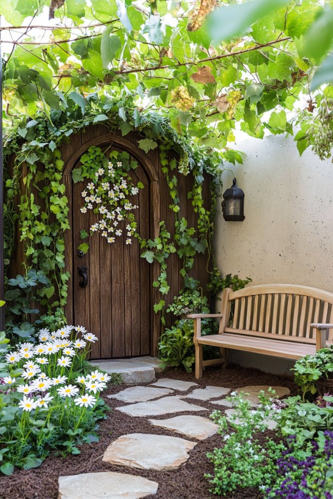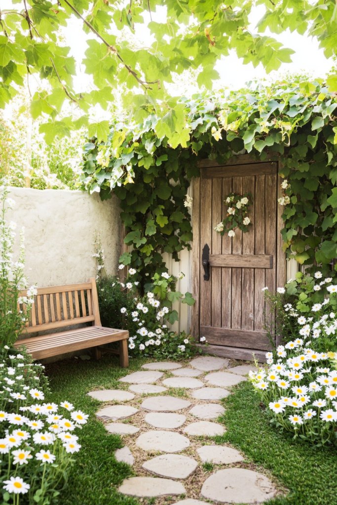 An old wooden door covered in creeping vines opens to a stone path lined with daisies and a hand-painted bench beneath a leafy canopy. To bring this fairy-tale look to life, use vintage accents, lush greenery, and delicate floral borders.