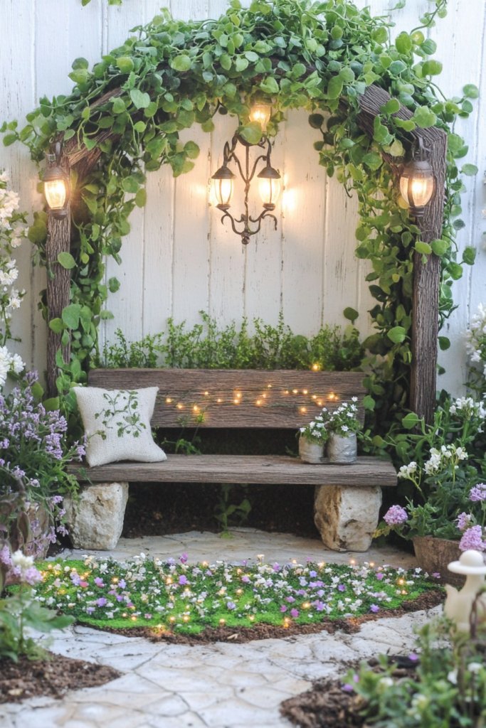 A rustic stone bench sits beneath an aged wooden archway covered in ivy, surrounded by miniature wildflower meadows and twinkling fairy lights. Achieve this enchanting feel with soft lighting, organic textures, and delicate floral accents.