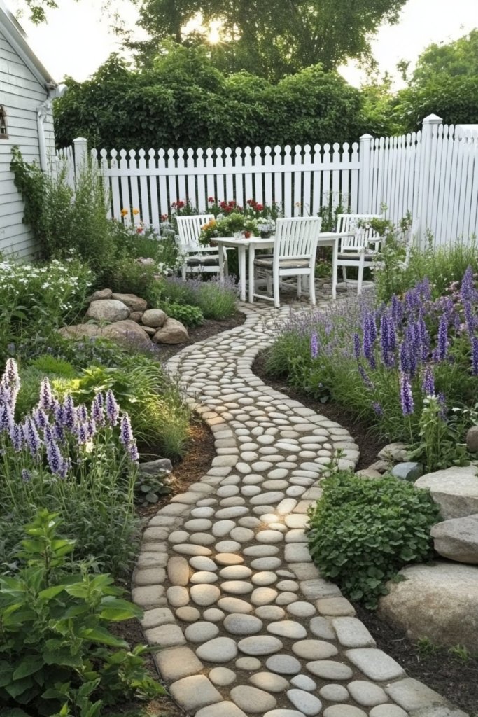 Winding stone paths lead through overflowing flower beds of lavender and foxgloves, enhancing the charm of a white picket fence. A quaint bistro seating area invites quiet morning moments in the soft golden light. Achieve this look by mixing wild perennials, curving pathways, and a cozy seating spot.