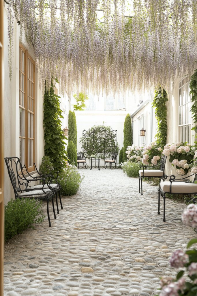 Cobblestone flooring, a delicate wisteria canopy, and vintage wrought iron seating set the stage for a fragrant retreat surrounded by herbs and pastel hydrangeas. Achieve this timeless look with cascading blooms, antique-inspired furniture, and aromatic plants.