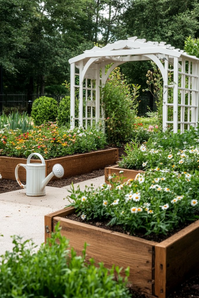 A miniature white arbor frames wooden planter boxes bursting with cottage blooms, while an old-fashioned watering can rests among the greenery. Recreate this look with pastel florals, vintage garden accessories, and a touch of whimsy.