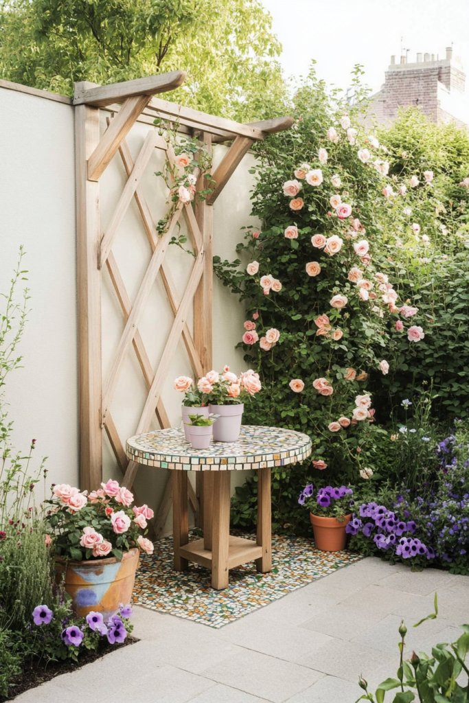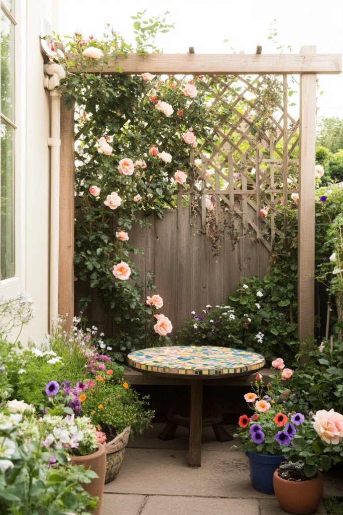 A quiet corner featuring a small wooden trellis wrapped in fragrant climbing roses, colorful potted violas, and a mosaic-tiled café table for peaceful moments. Bring this space to life with intimate seating, potted flowers, and a touch of mosaic artistry.
