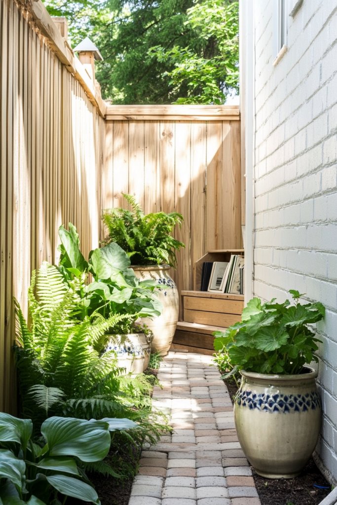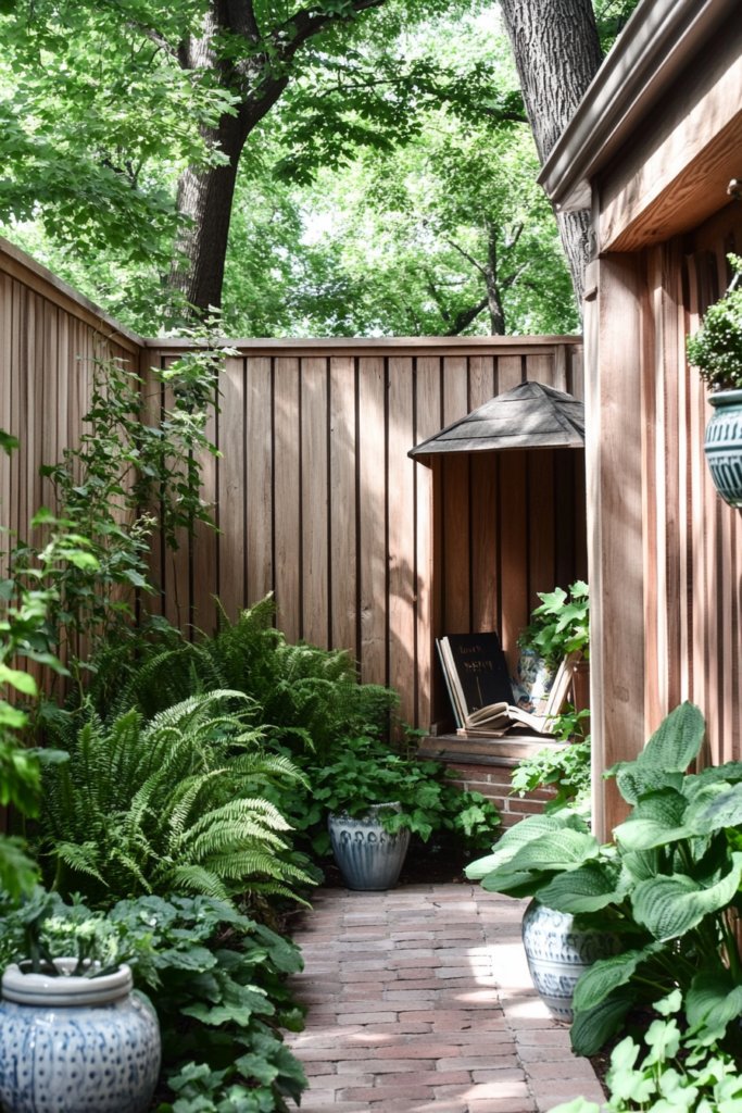 A natural wooden fence surrounds ferns and hostas, creating a refreshing oasis. Vintage ceramic pots and a narrow brick walkway lead to a hidden reading nook, offering a secluded garden escape. Use and soft earth tones for a similar tranquil setting.