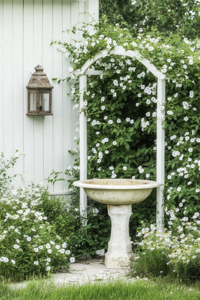 A weathered stone birdbath sits at the heart of this hidden oasis, surrounded by wildflowers and a jasmine-covered garden arch. Antique-style lanterns add a magical glow. Recreate this fairy-tale feel with fragrant climbers, vintage accents, and soft lighting.