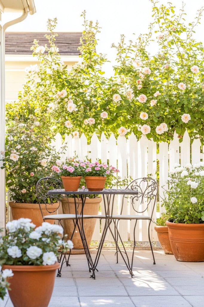 A cozy retreat featuring a vintage metal bistro set surrounded by terracotta pots bursting with geraniums. A classic white picket fence frames the space, while climbing roses cast soft dappled sunlight, creating a dreamy, timeless atmosphere. Recreate this look with rustic metal furniture, sun-loving flowers, and trellised roses.