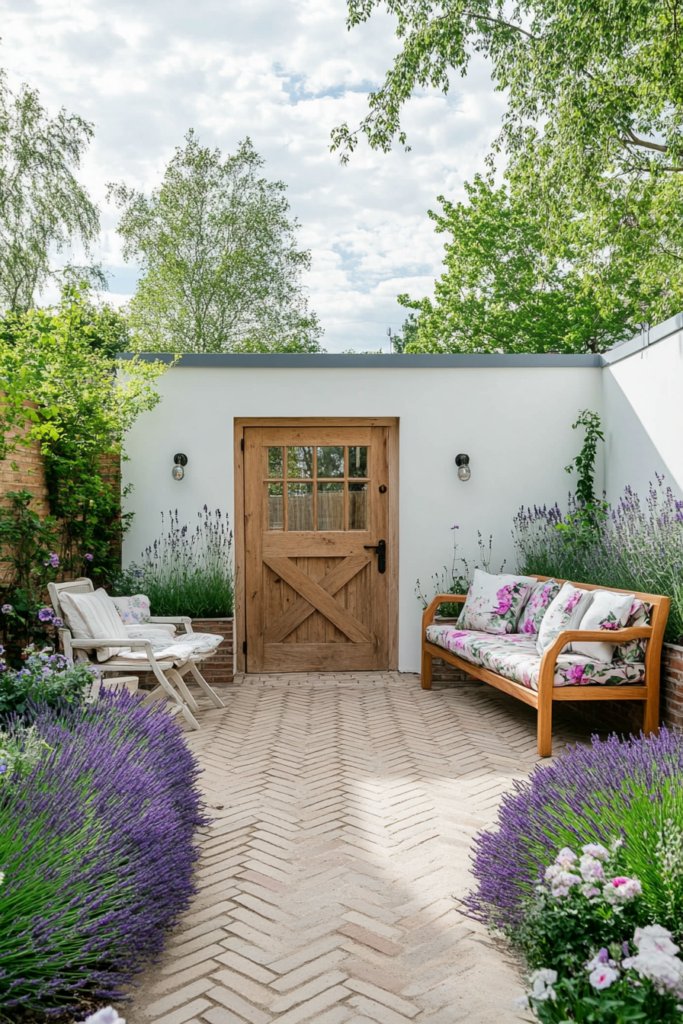 A rustic wooden gate opens to herringbone brick paving lined with lavender. Vintage floral-cushioned garden furniture invites relaxation in this secluded courtyard. Use reclaimed bricks, soft-hued fabrics, and aromatic plants to bring this space to life.