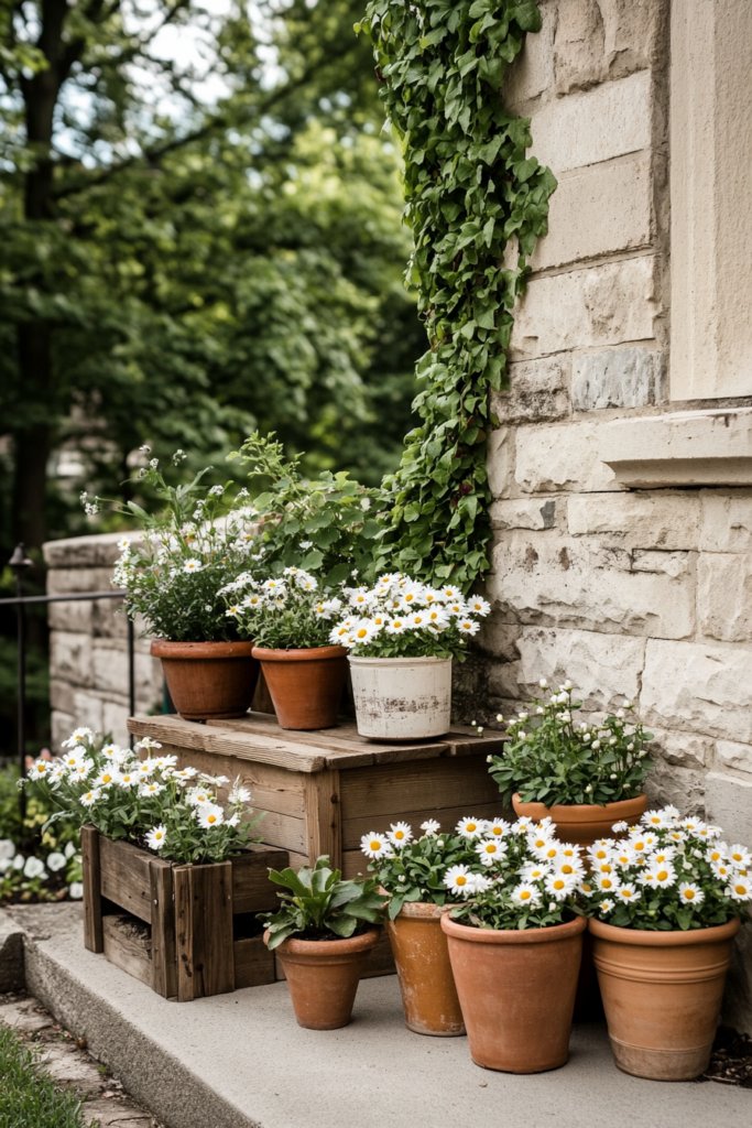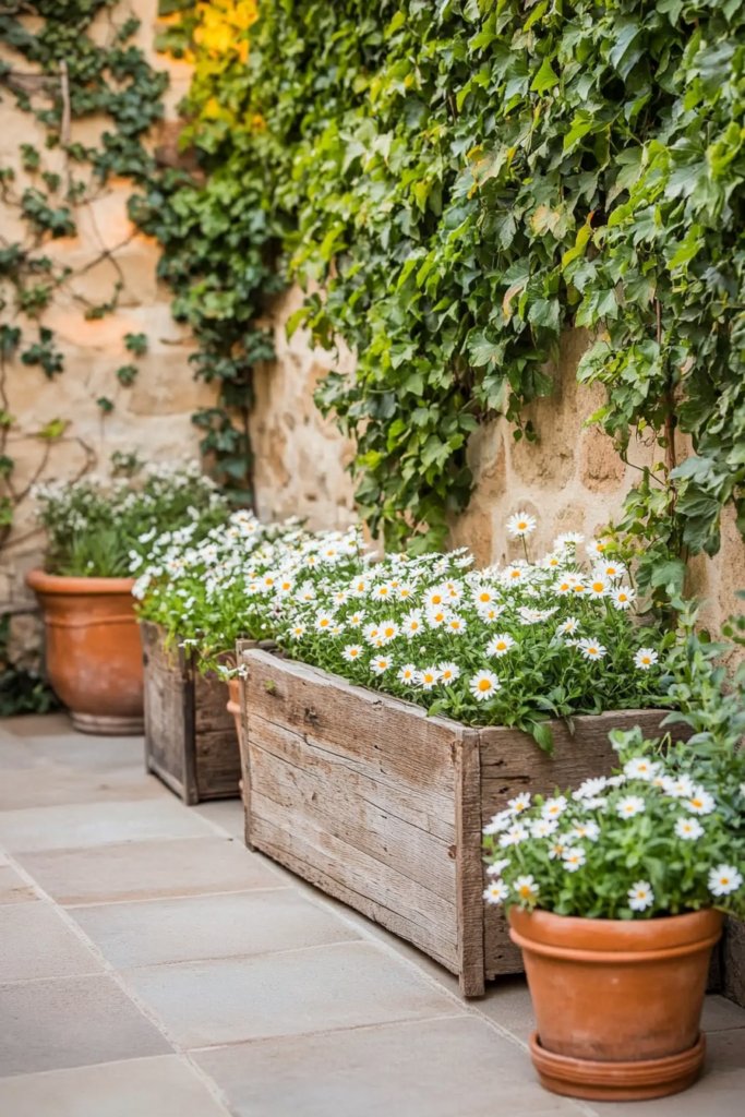 Repurposed wooden planters brim with daisies and petunias, while cascading ivy softens a low stone wall enclosing this intimate space. Terracotta pots add warmth, making it perfect for a lush yet structured garden. Try layering greenery with rustic containers for a charming, organic feel.