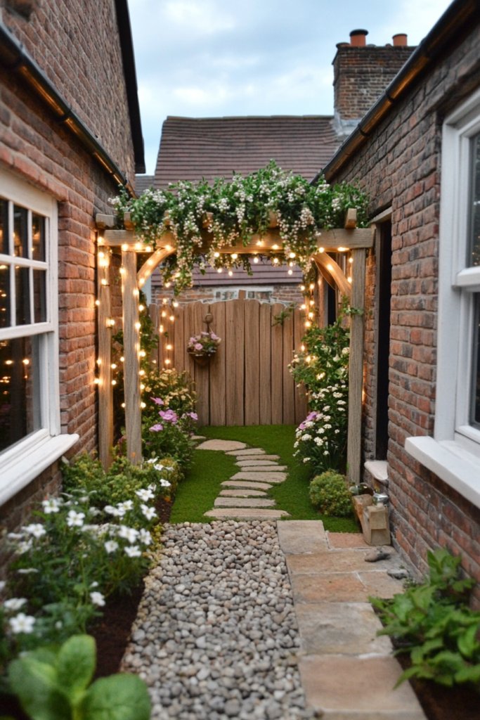 Tucked between brick houses, this charming retreat features fairy lights, a wooden pergola covered in honeysuckle, and a tiny stone pathway leading to an aged wooden gate. Achieve this look with climbing vines, soft lighting, and natural wood elements.