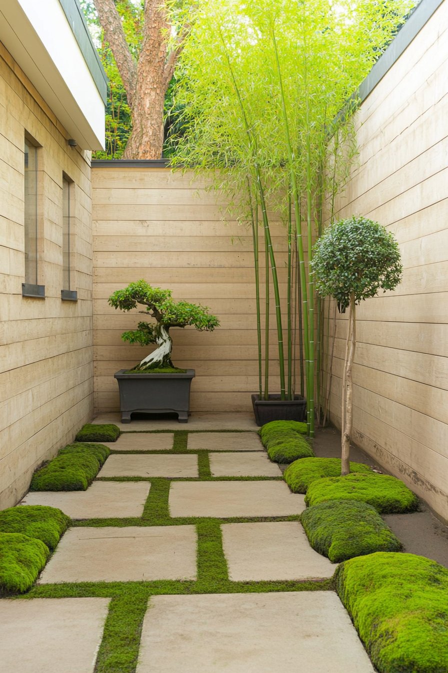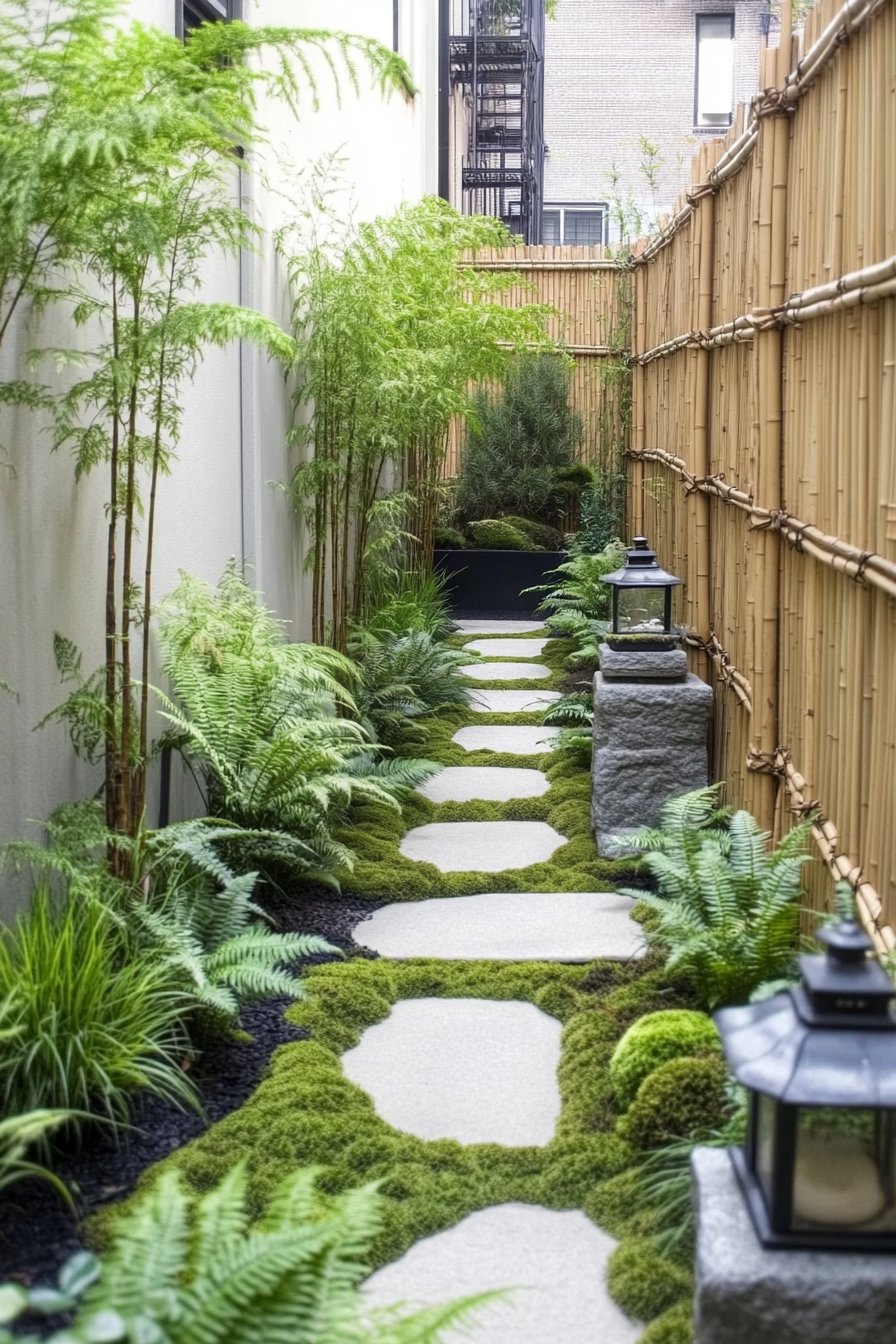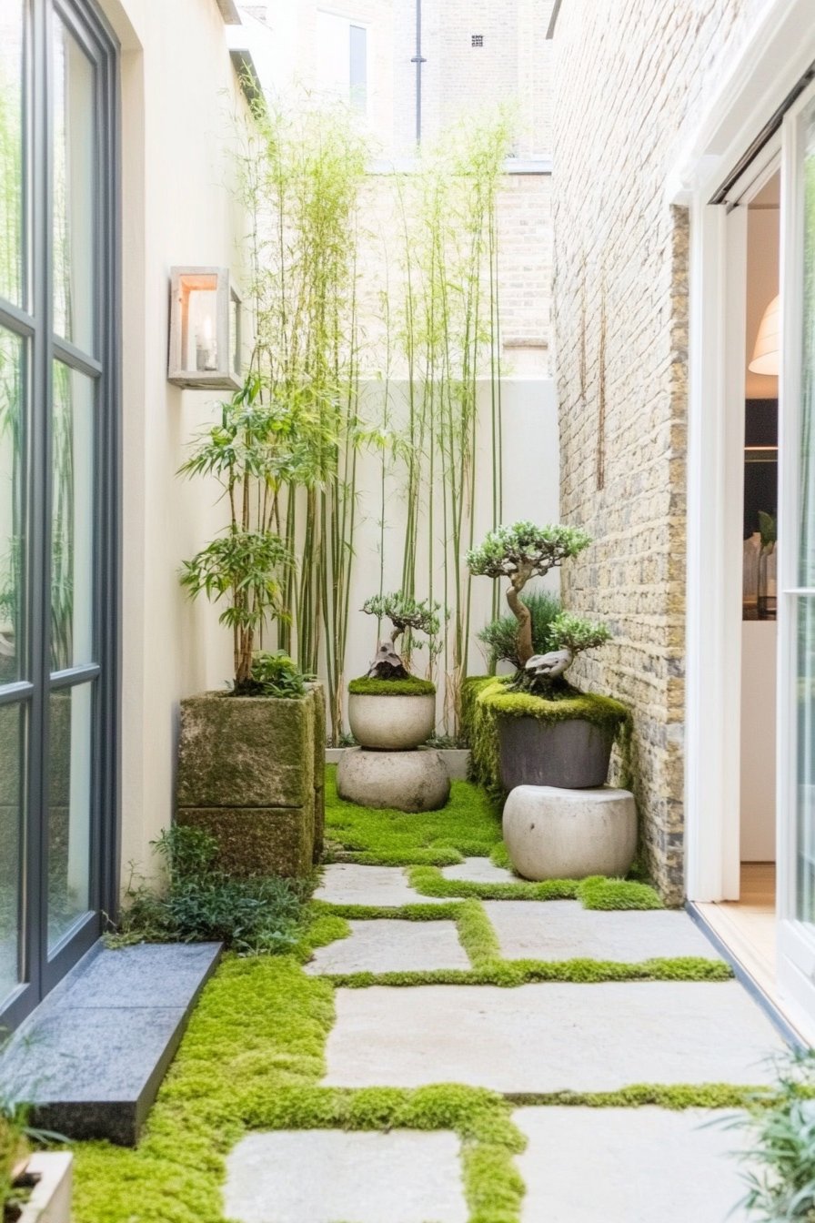 To achieve a similar look, incorporate tall bamboo and carefully chosen planters for a layered effect. Use natural stone for pathways and let moss thrive in the gaps for a lush, inviting feel.