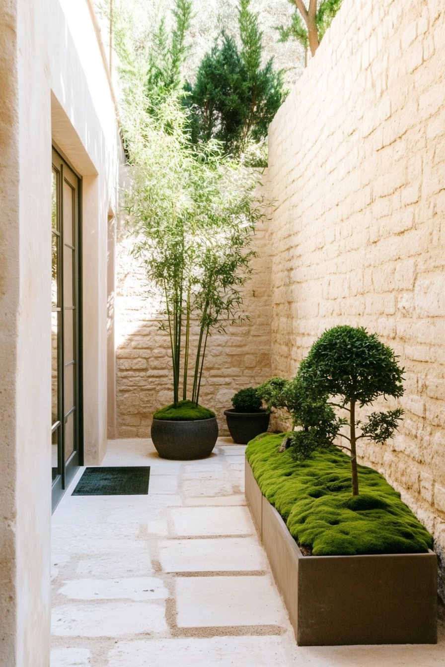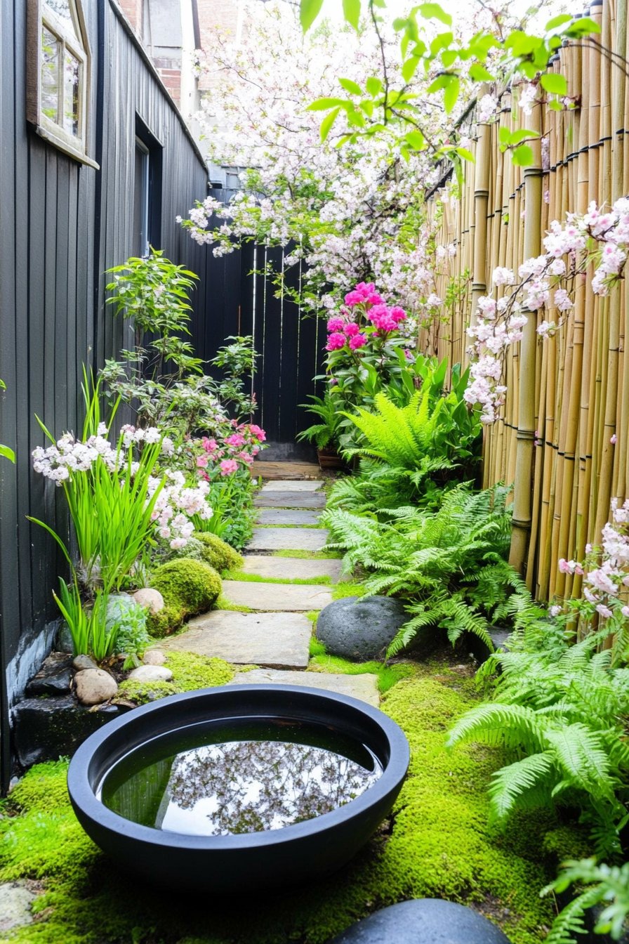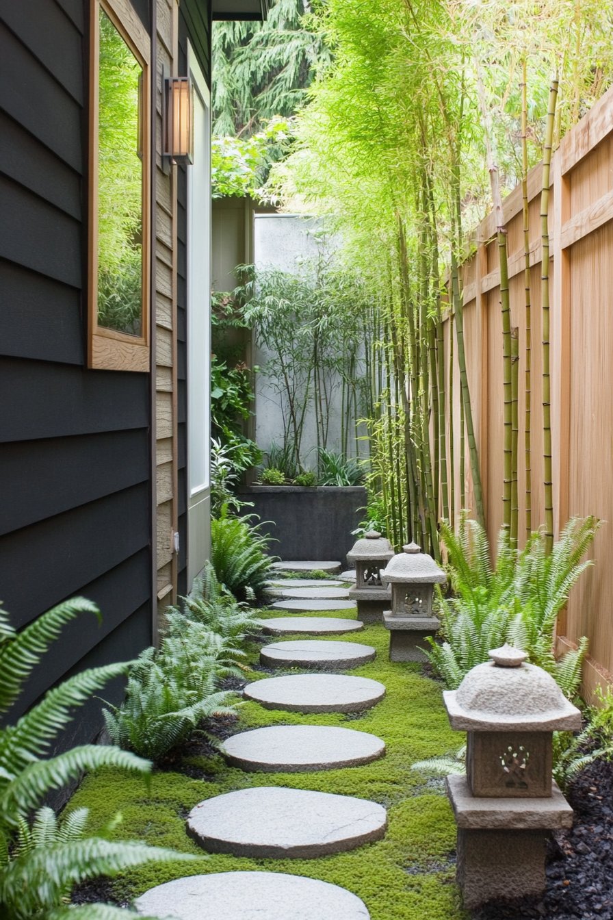 To achieve a similar look, incorporate tall bamboo and carefully chosen planters for a layered effect. Use natural stone for pathways and let moss thrive in the gaps for a lush, inviting feel.