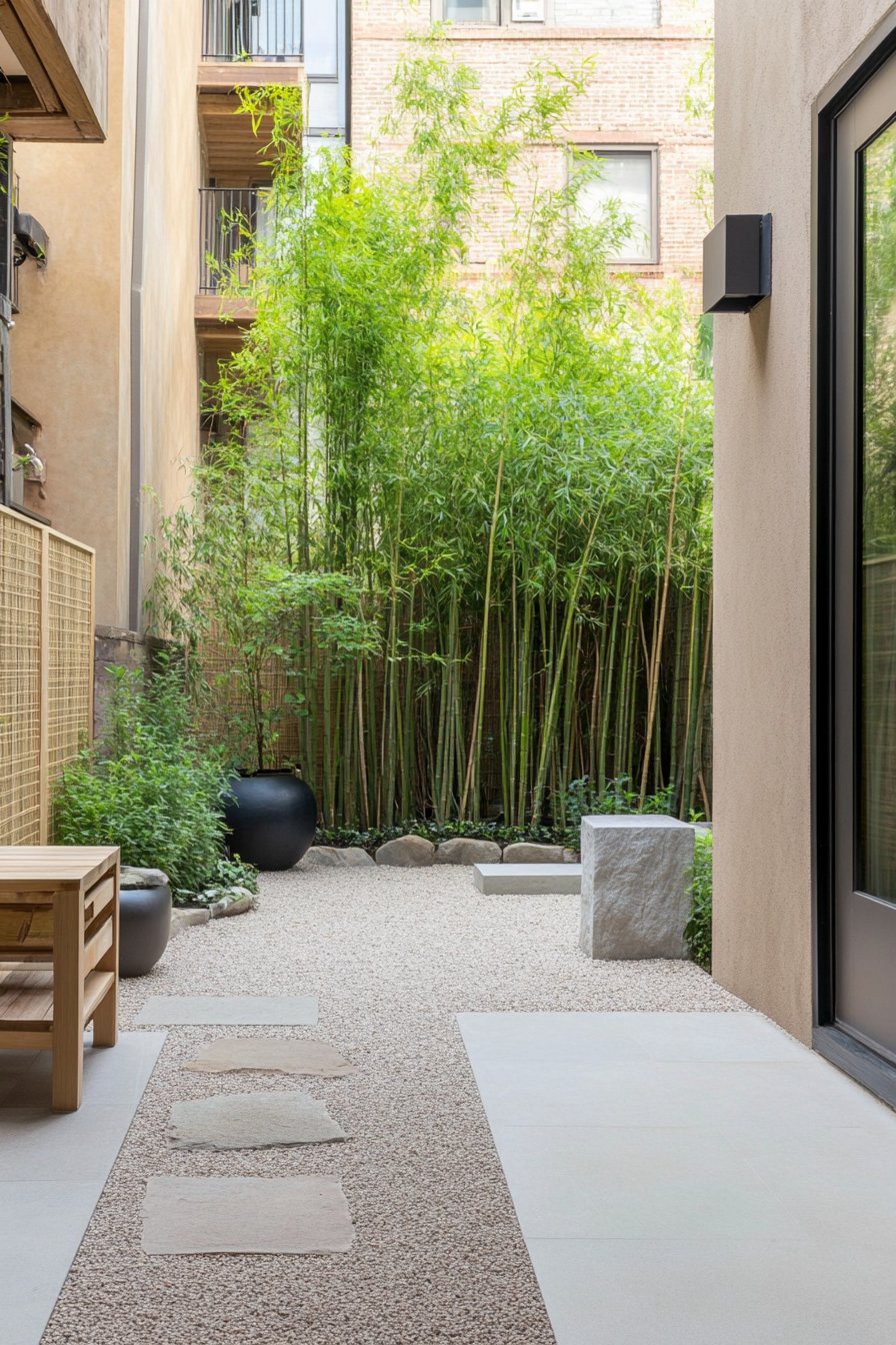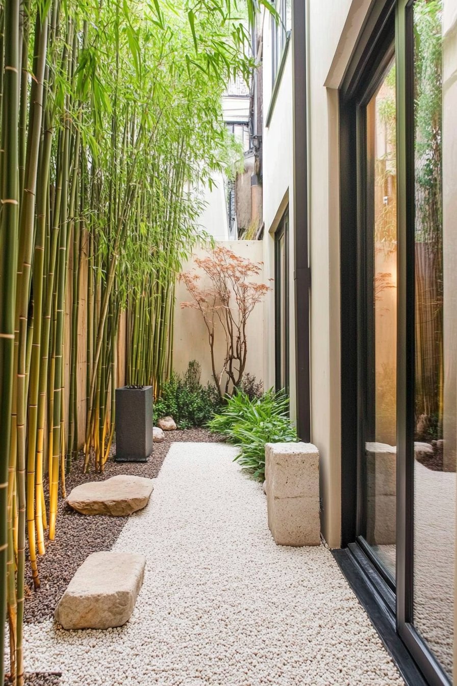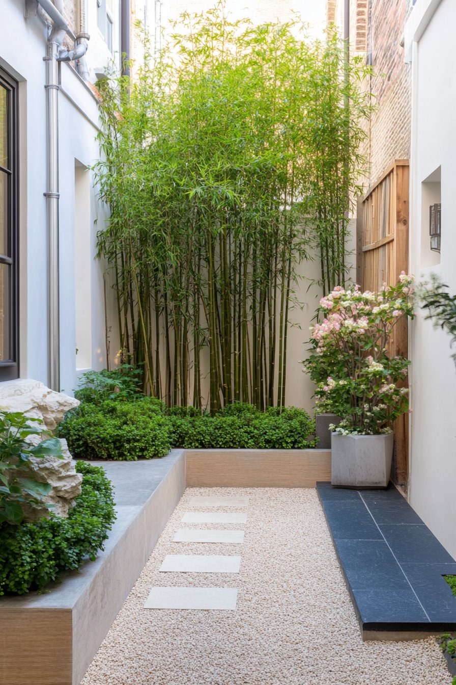 This garden exudes tranquility with its lush bamboo and carefully placed stones. The combination of white gravel and dark accents creates a striking contrast that invites relaxation.