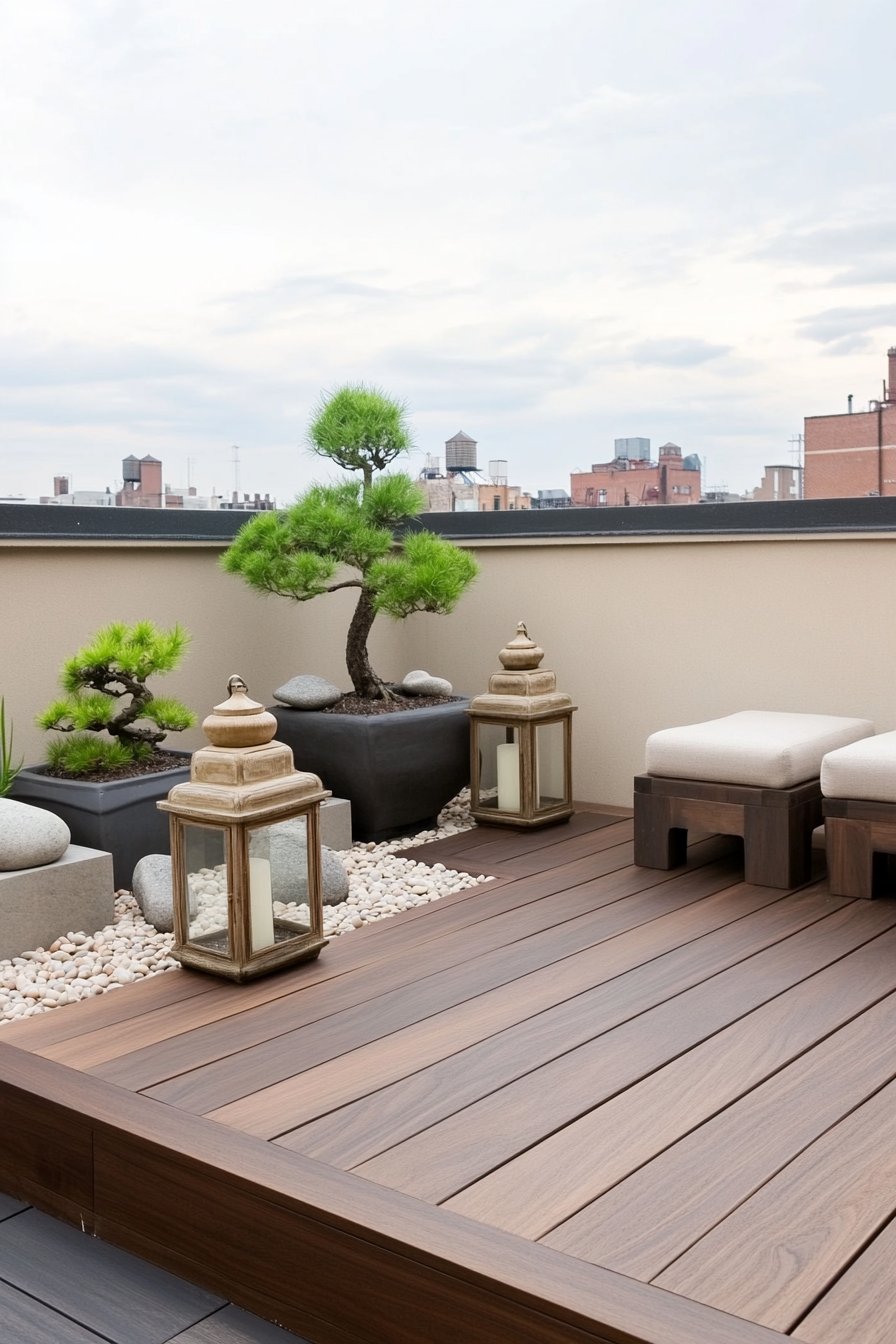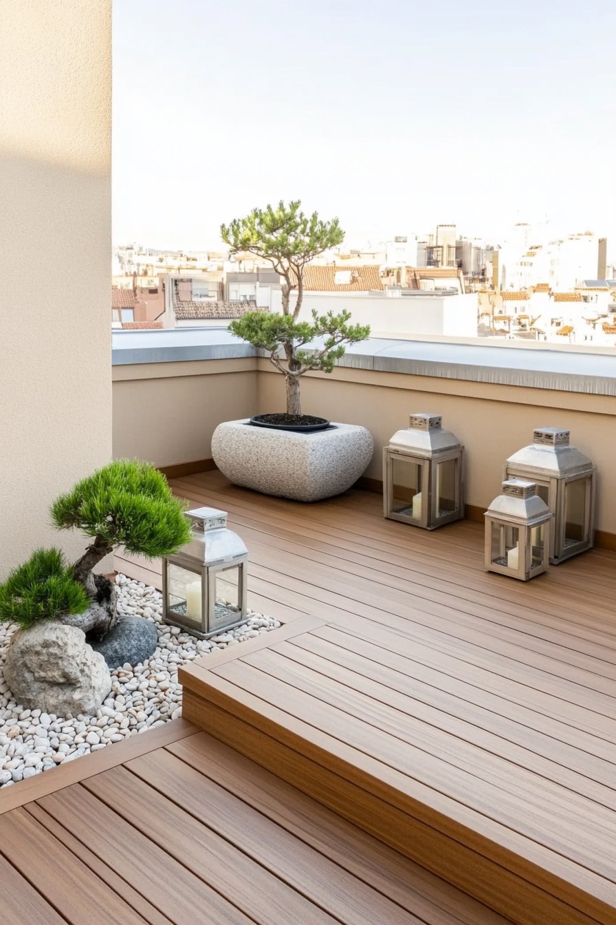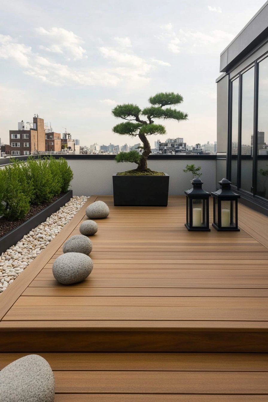 This design beautifully blends natural elements with a sleek, modern aesthetic. The warm wooden decking paired with minimalist stone and lantern accents creates a serene atmosphere.
