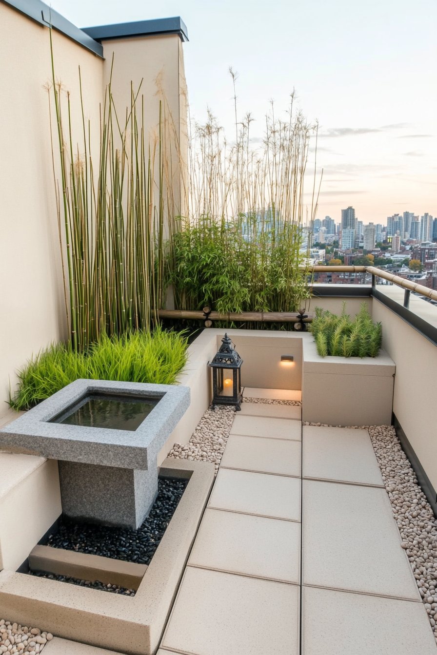 This rooftop garden blends modern design with natural elements, featuring sleek stone pathways, lush greenery, and calming water features. To achieve a similar look, I recommend incorporating vertical bamboo and soft grasses alongside minimalist stone accents.