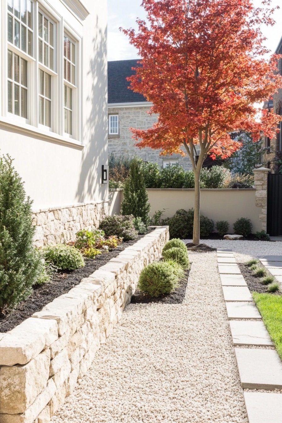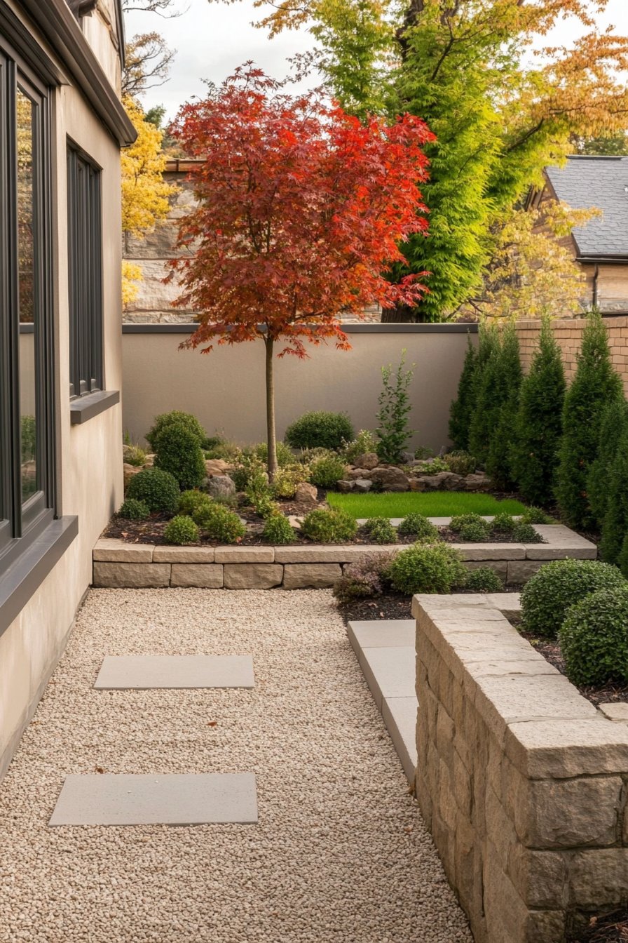 This design features a harmonious blend of natural stone, vibrant foliage, and clean lines. The striking red maple tree adds a focal point, while the gravel pathway and well-placed plantings create a serene ambiance.