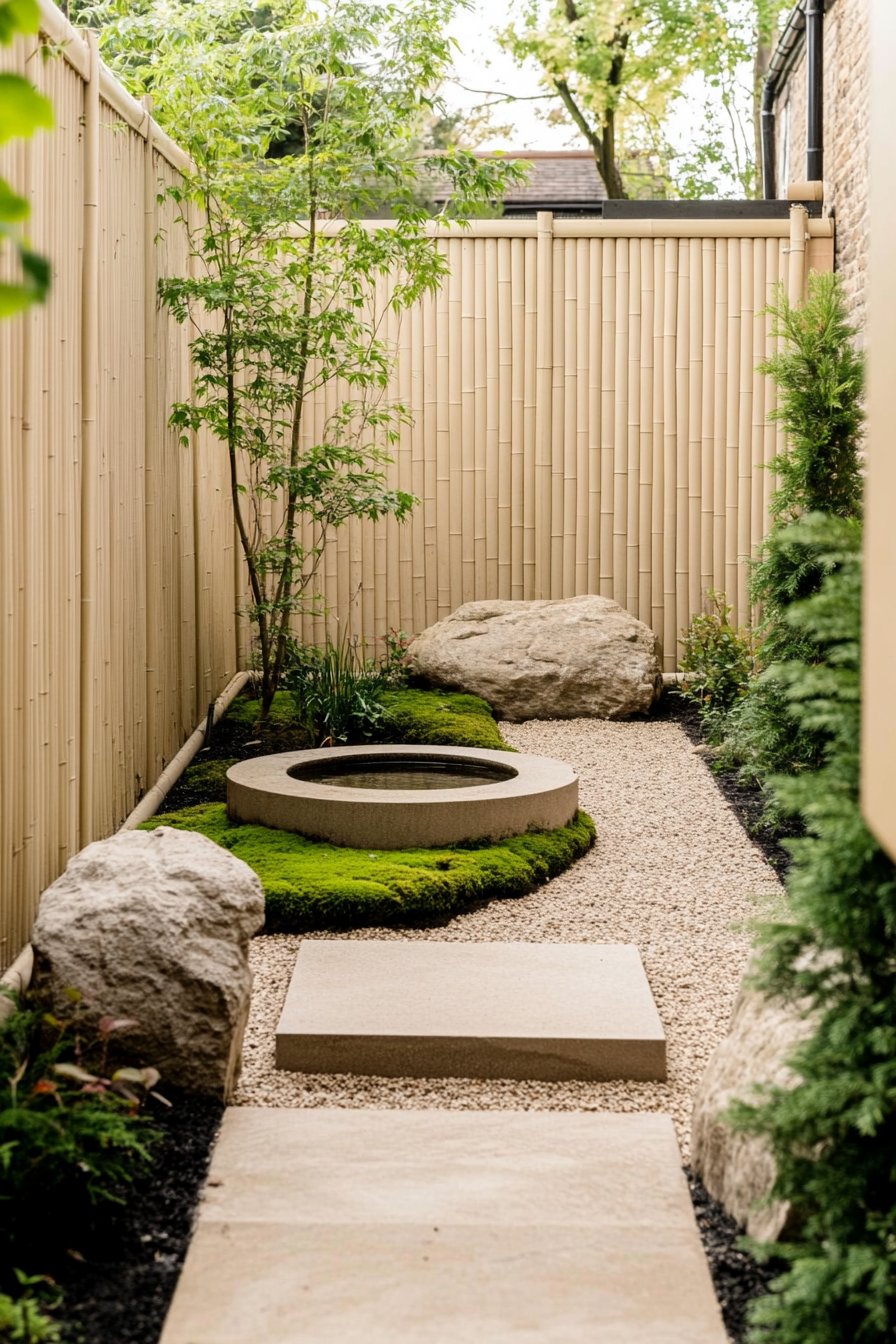 To achieve a similar look, I suggest incorporating bamboo panels for privacy and texture. Choose carefully curated plants like bonsais and a simple water feature to enhance the calming vibe.