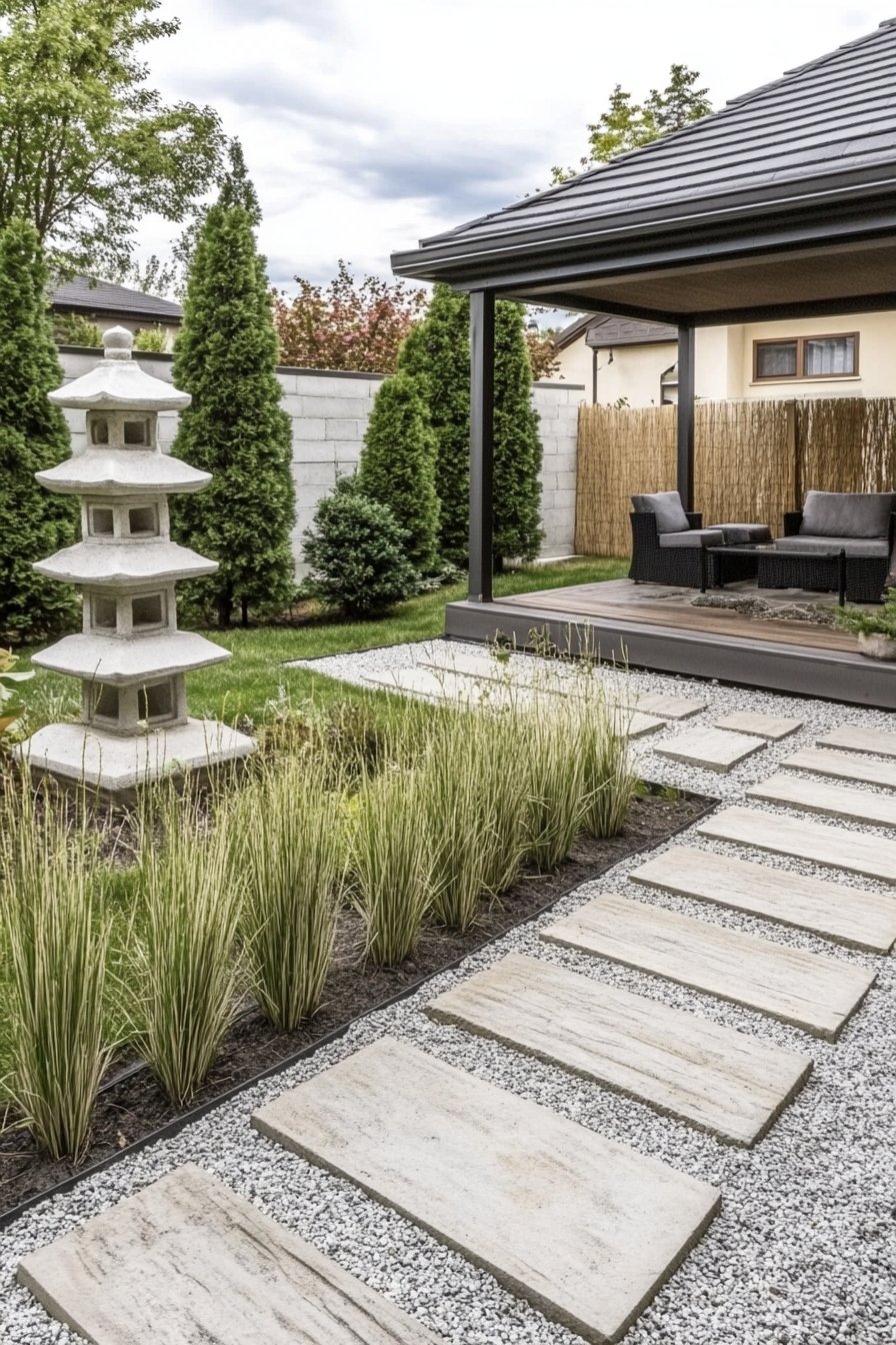 To achieve a similar look, I recommend using a mix of gravel and stepping stones for the path, paired with tall grasses for vertical interest. Incorporating a focal point like a stone lantern enhances the tranquil vibe, making the space perfect for unwinding.