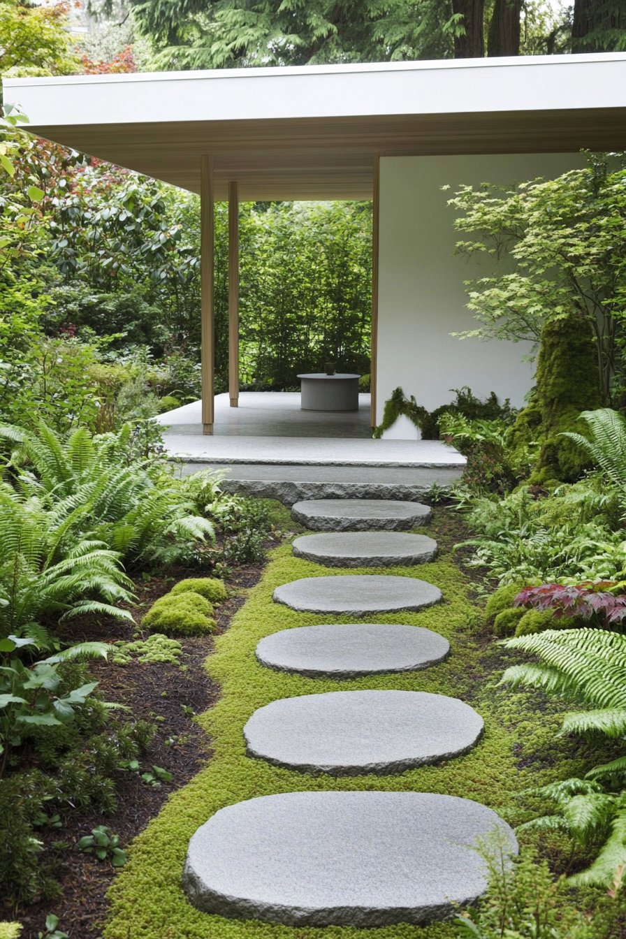 This design beautifully blends modern architecture with lush greenery. The stepping stones, set against a vibrant moss carpet, create an inviting path to a serene outdoor space.