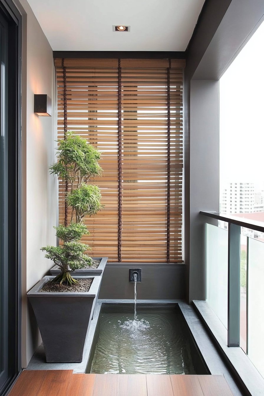 To achieve a similar look, incorporate a small water feature alongside carefully chosen plants, such as bonsai trees. Use neutral colors and natural textures to enhance the tranquility of your space.