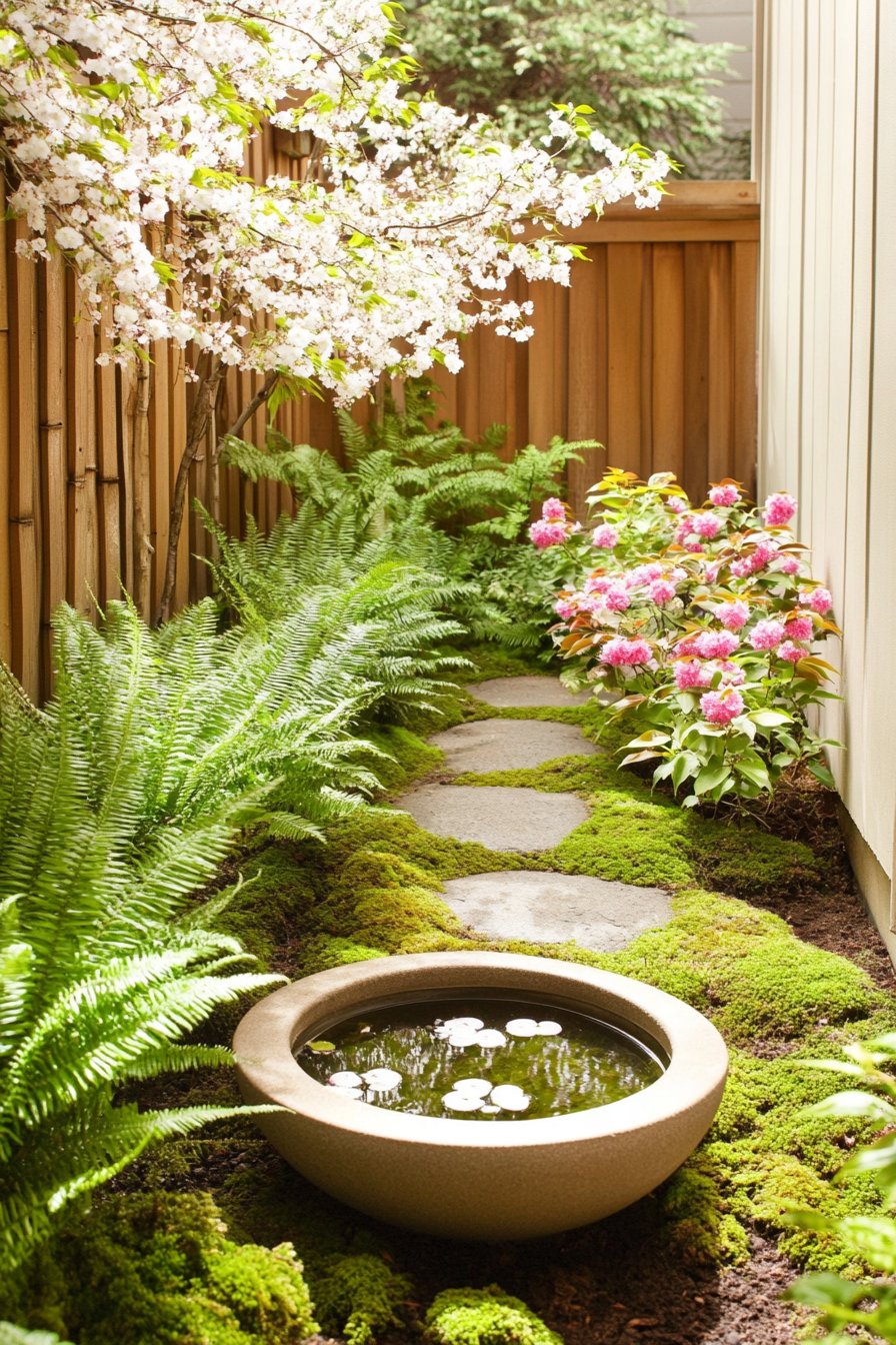 This design features a serene pathway lined with lush ferns and vibrant pink flowers, creating a harmonious blend of textures and colors. The central water feature adds tranquility, inviting reflection and peace.